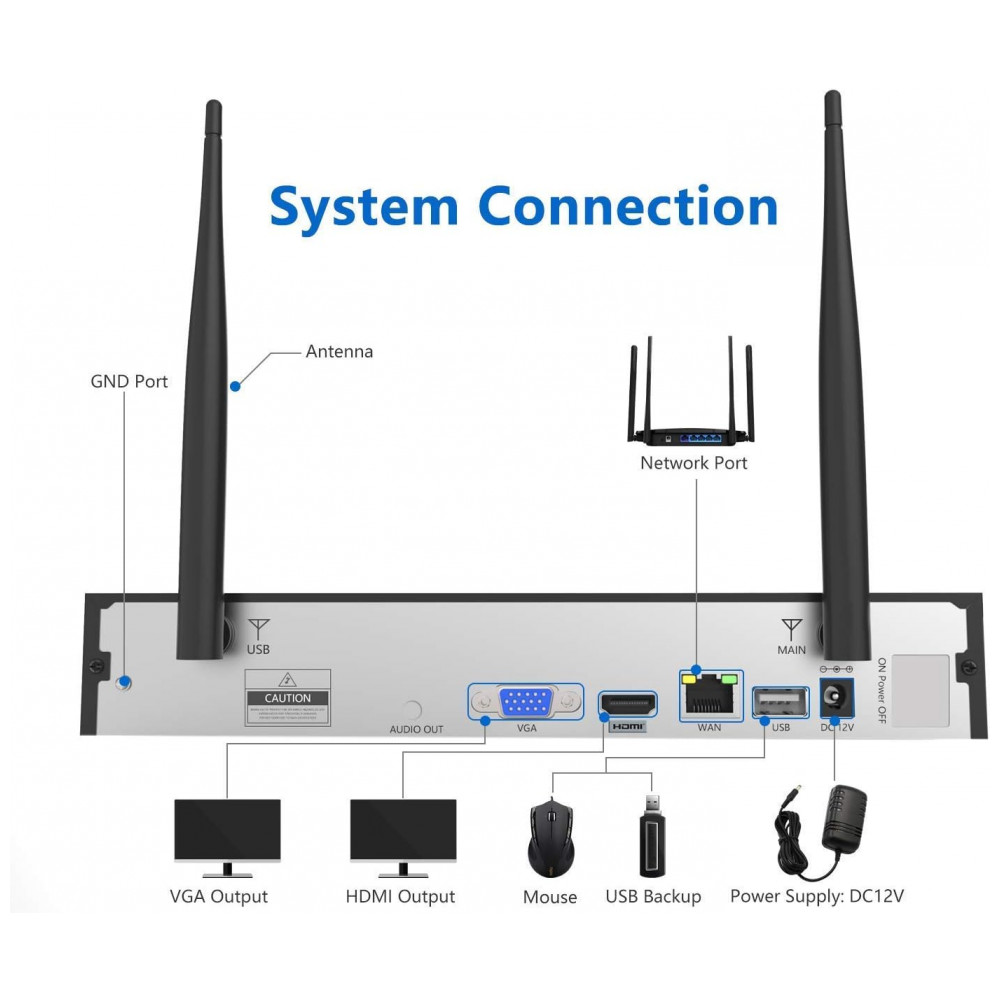 COMO FUNCIONA Conecte as câmeras e o NVR à energia, conecte o Mouse ao NVR. Conecte o monitor de PC, TV ao NVR com um cabo VGA, HDMI. Conecte a porta LAN do roteador à porta WAN do NVR com o cabo de rede fornecido. Em seguida, o vídeo estável e de fluxo será recebido por nossa transmissão de sinal Wifi profissional com base no ajuste de taxa de código automático.