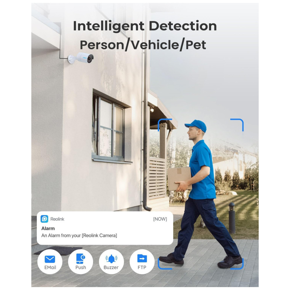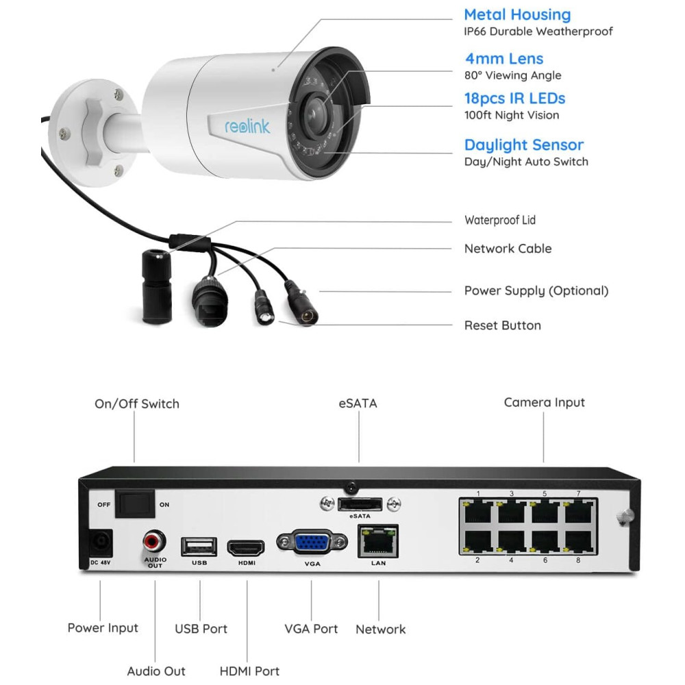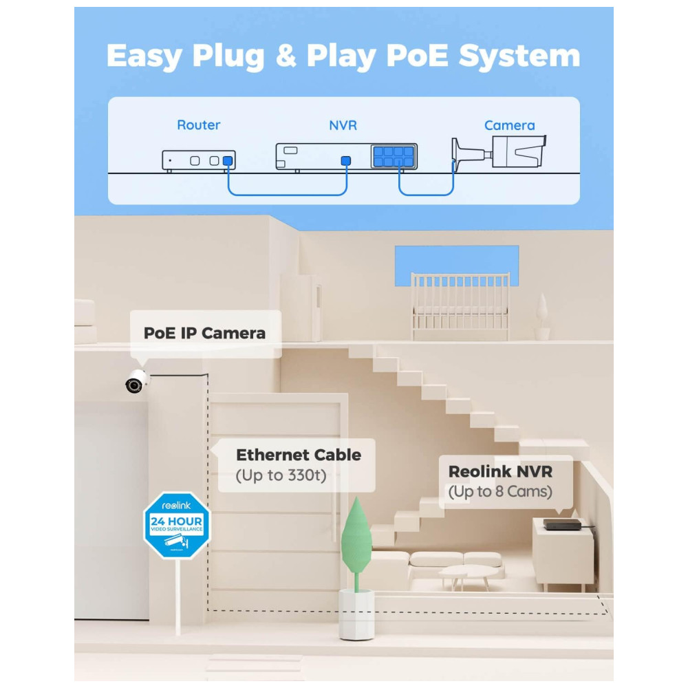 Operação flexível As câmeras Reolink 5MP são equipadas com 8 portas PoE no gravador de vídeo NVR, tornando o sistema de segurança flexível o suficiente para funcionar com até 8 câmeras Reolink PoE, bullet ou dome