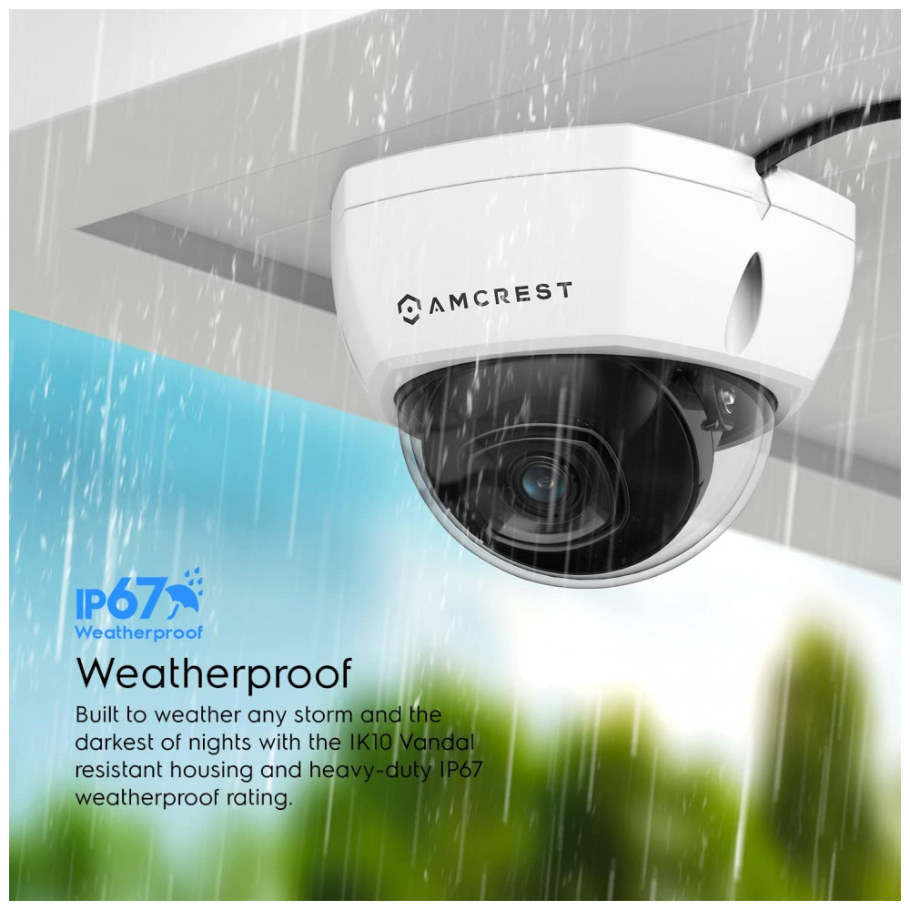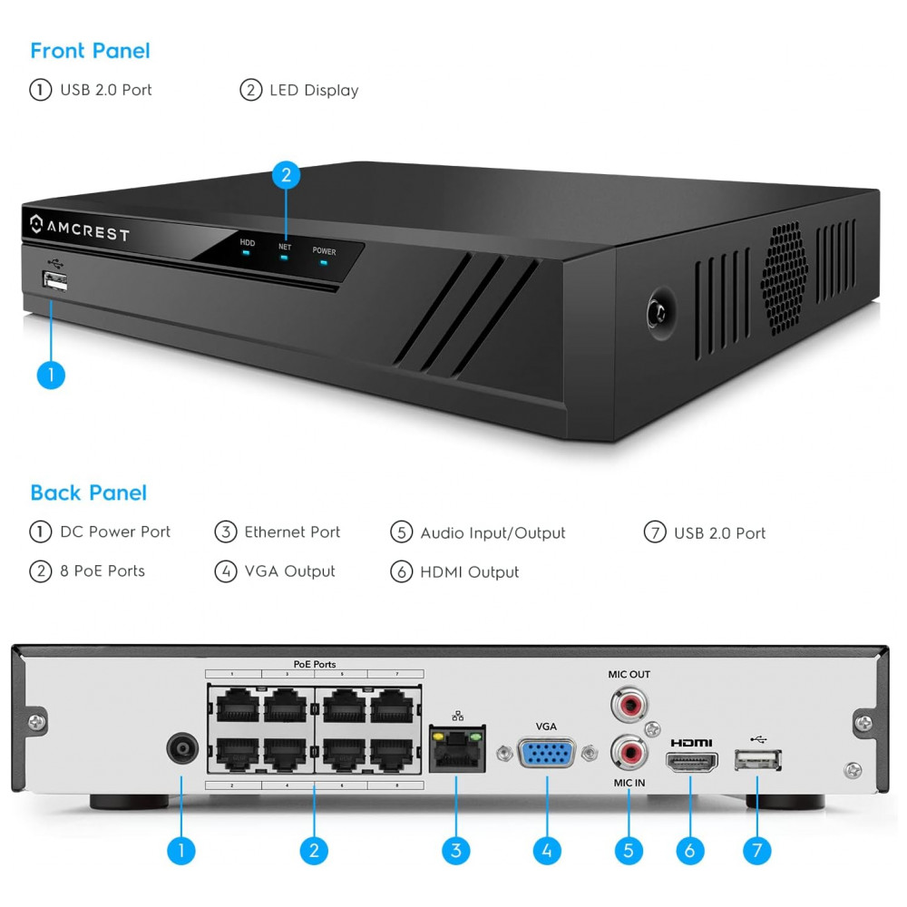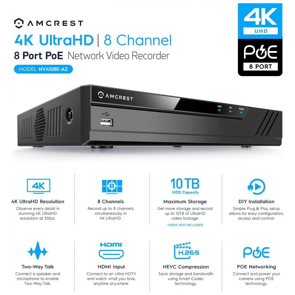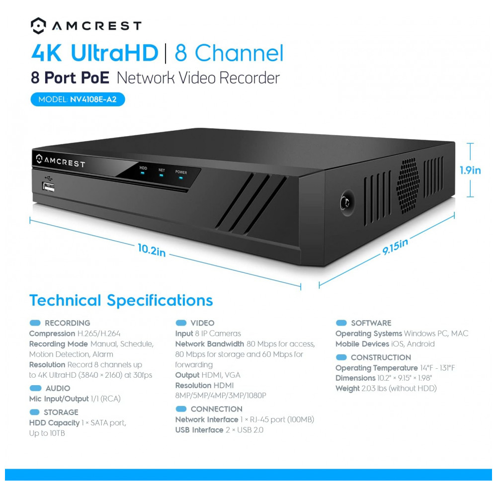 O sistema Amcrest vem com um disco rígido pré instalado de 2 TB suporta discos rígidos de até 10 TB enquanto apresenta gravação de 8 canais, a mais recente compressão de vídeo H.265, PoE de 8 portas e reprodução de 8 canais a 1080p 30fps, 4 canais 4MP30fps, 2 canais 4K30fps. Inclui 4 câmeras IP PoE Outdoor Dome de 8 MP 4K 3840 x 2160P a 15 fps. Inclui 4 cabos Ethernet Cat6 de 18 metros..