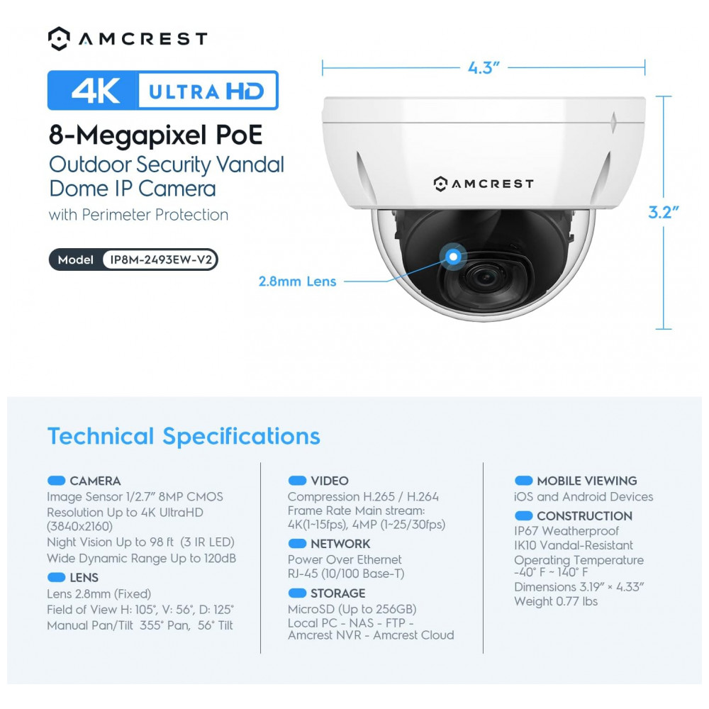 Experimente UltraHD 4K observe imagens de alta qualidade com um sensor de imagem CMOS de varredura progressiva, chipset e resolução UltraHD 4K 8M 3840×2160. Um ângulo de visão super amplo de 125 permite que você veja mais detalhes e cubra mais terreno para manter mais o que você ama. Power Over Ethernet POE para fácil instalação.