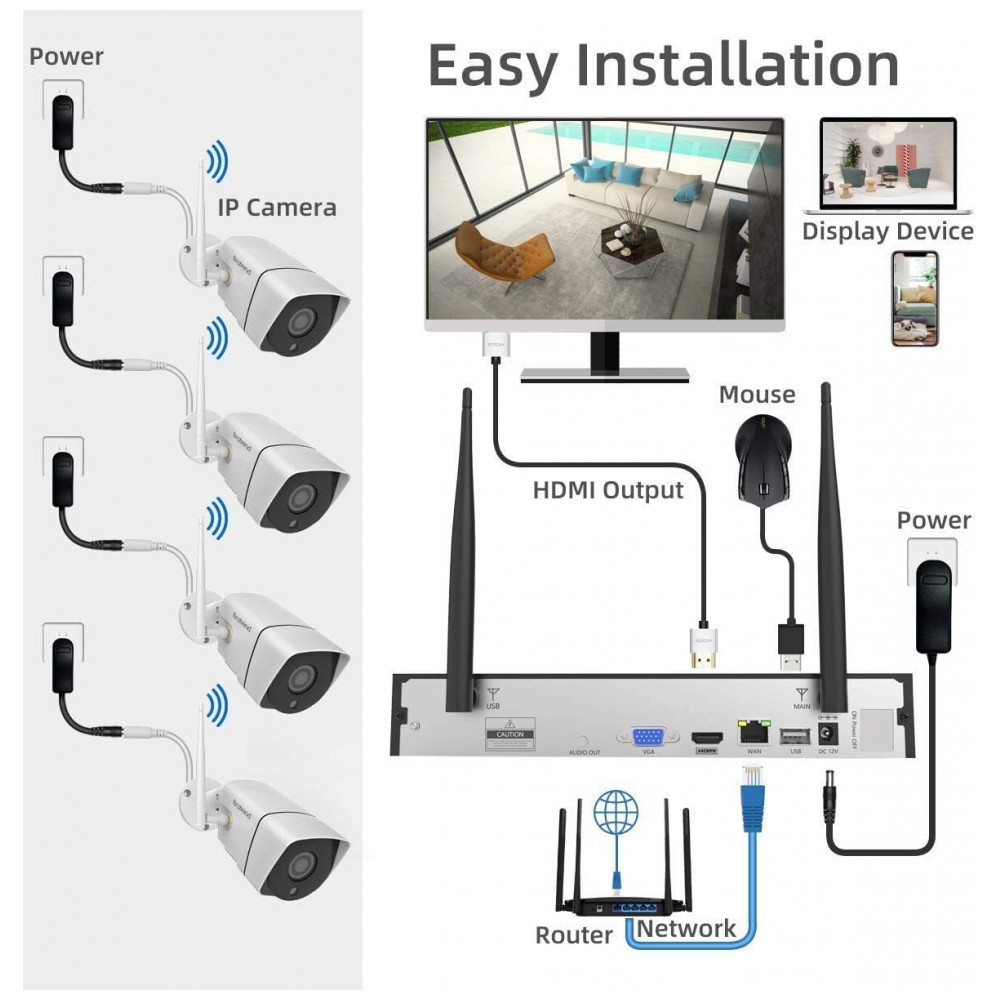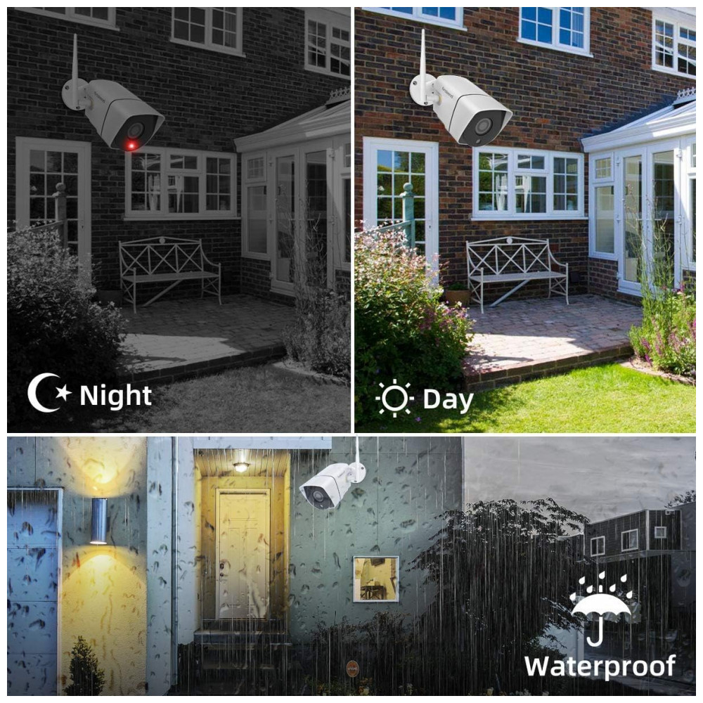 SISTEMA DE SEGURANÇA SEM FIO O kit NVR de vigilância diurna e noturna vem com 4 unidades de câmeras sem fio Full HD de 2 MP 1080P IP66 à prova dágua, NVR 1080P com disco rígido de 1 TB pré instalado. É equipado com vários recursos, como visão noturna até 65 pés, transmissão ao vivo, monitoramento remoto e alertas de detecção de movimento.