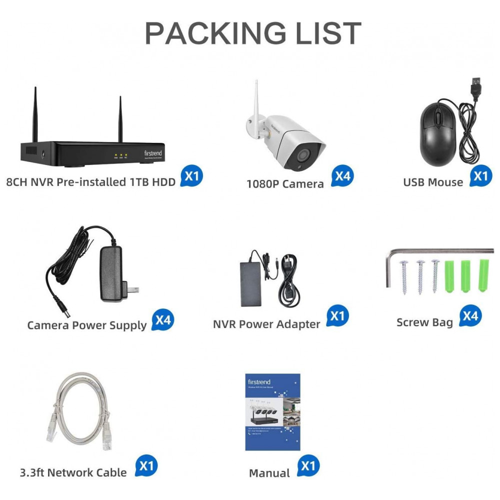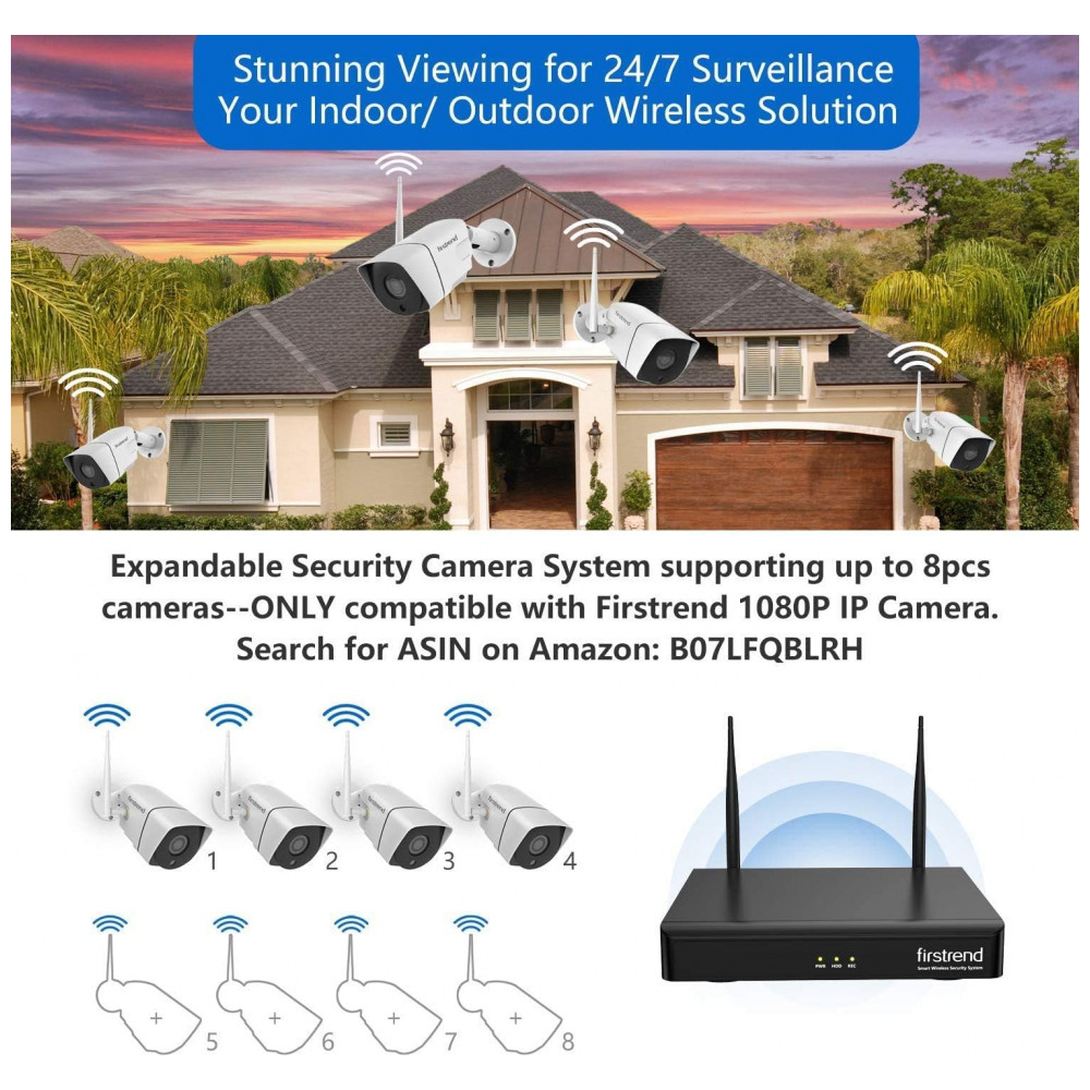 Sistema de Câmera de Segurança sem Fio 8 Canaus 1080p 2MP 1 TB HDD 4 Câmeras Firstrend W843M1T XM