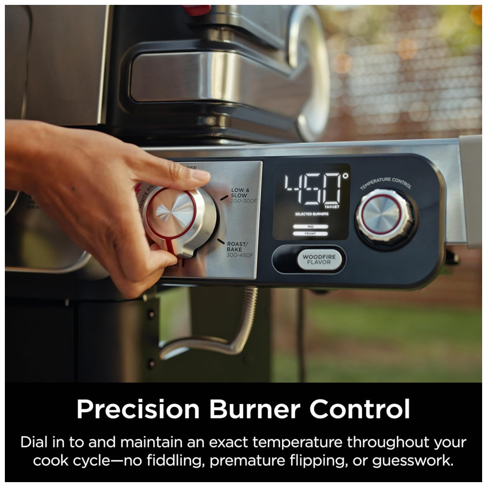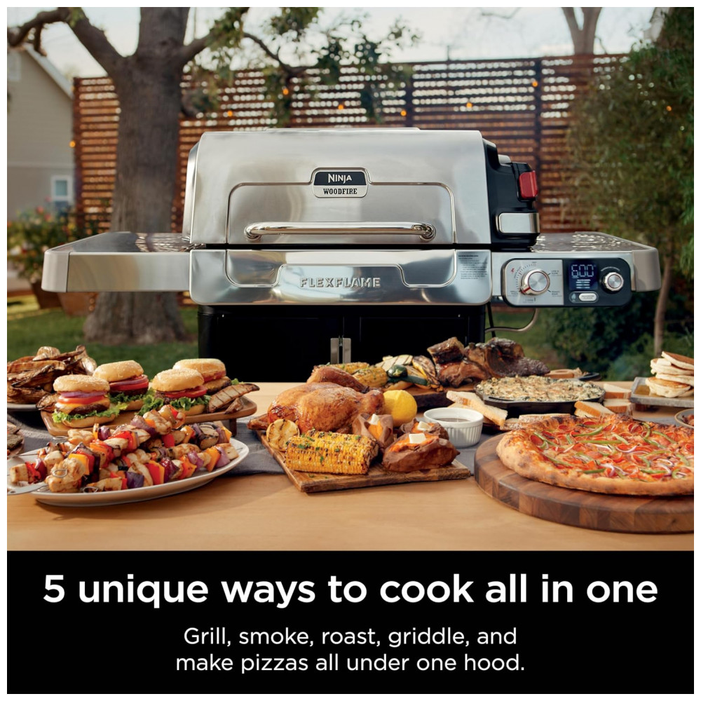 O sistema de cocção externa Ninja FlexFlame é uma estação completa para uso ao ar livre que combina churrasqueira e defumador a gás com apoio elétrico e um cooler rígido FrostVault de 30 litros. Ele permite grelhar, defumar, assar, utilizar chapa (griddle) e preparar pizzas com acessório específico, reunindo cinco modos de cocção em um único equipamento com controle digital de temperatura.