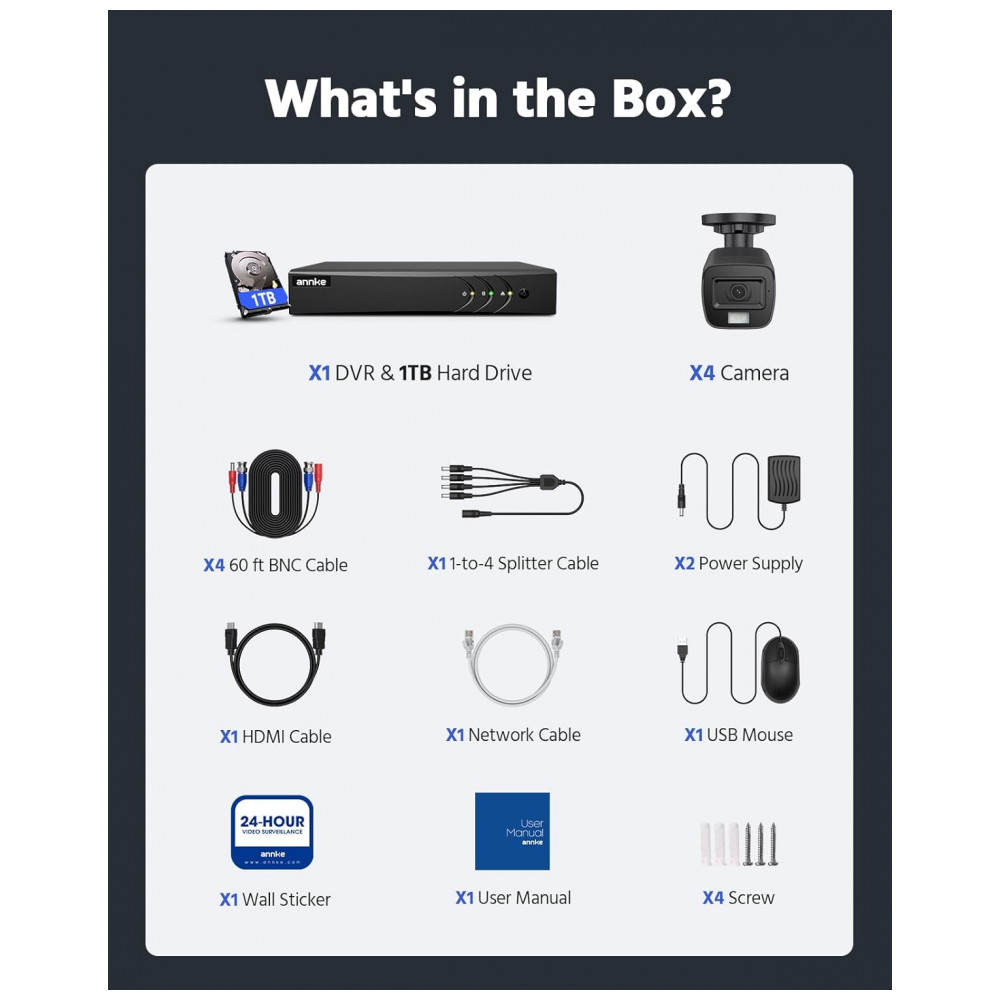 DVR de 1 x 8CH 5MP Lite com unidade de disco rígido de 1 TB de nível de segurança 4 câmeras de segurança com fio de 2MP para interior e interior Uso externo 2 x adaptadores de energia para DVR e câmeras 1 x mouse USB e Manual do usuário Cabos BNC de 4 x 60 pés 1 x divisores de potência de 4 para 1 x kits de parafuso de montagem 1 x cabo HDMI de 5,9 pés , 1,8 m 1 x cabo Ethernet de 3,2 pés , 1 m