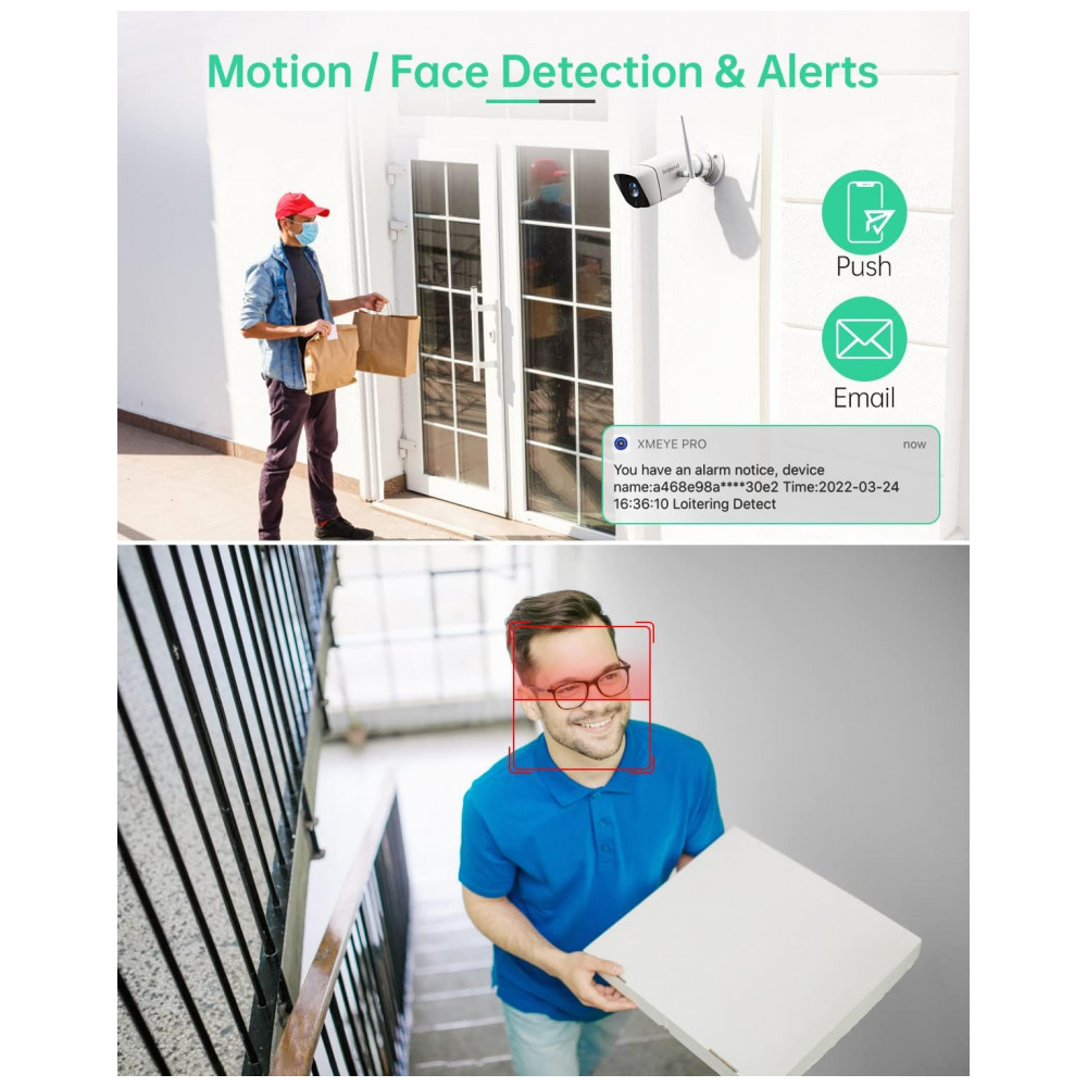 Detecção atualizada de rosto e movimento Este mais sistema de câmeras sem fio de 5MP está equipado com detecção atualizada do rosto humano. Se a detecção de movimento acionar algum alarme errado, você poderá ativar a detecção de rosto e obter alarmes mais precisos. Não se preocupe mais com a mensagem errada