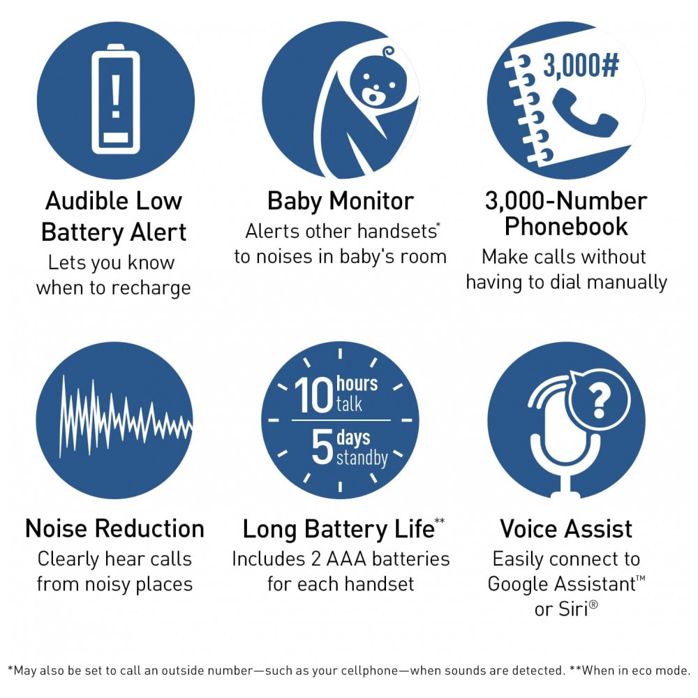 Funções de voz e monitor de bebê o viva voz duplex completo permite que você use o telefone com as mãos livres e use comandos de voz o aparelho pode monitorar facilmente diferentes áreas da casa , como o quarto de um bebê , mesmo longe de casa