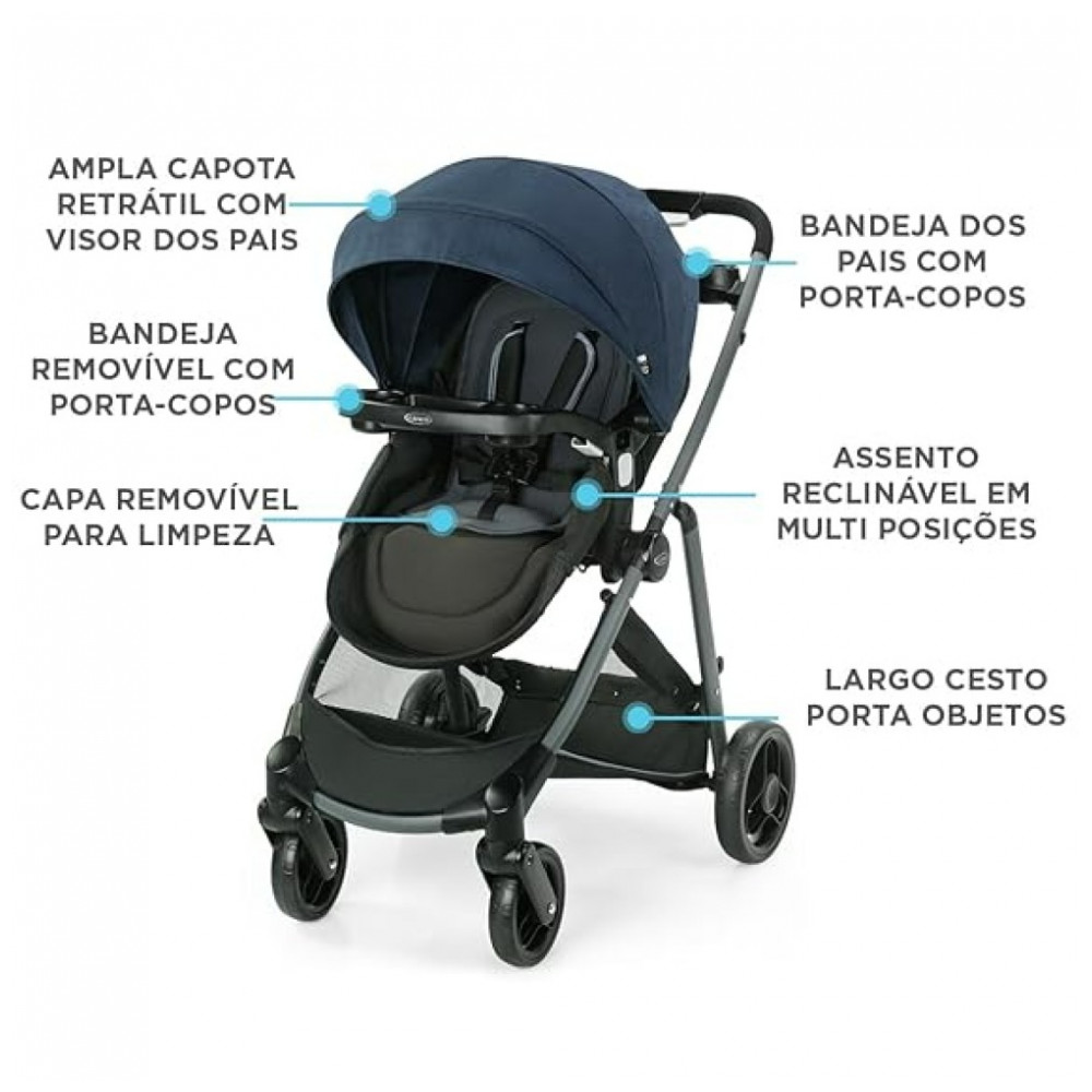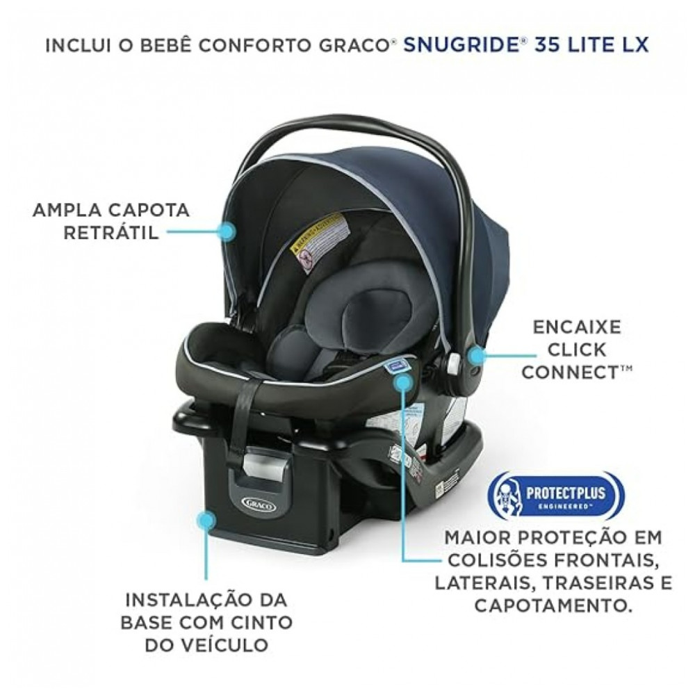 O sistema de viagem inclui a cadeirinha infantil Graco SnugRide 35 Lite LX, voltada para trás de 197,28 quilos, para uma transição perfeita do carro para o carrinho
