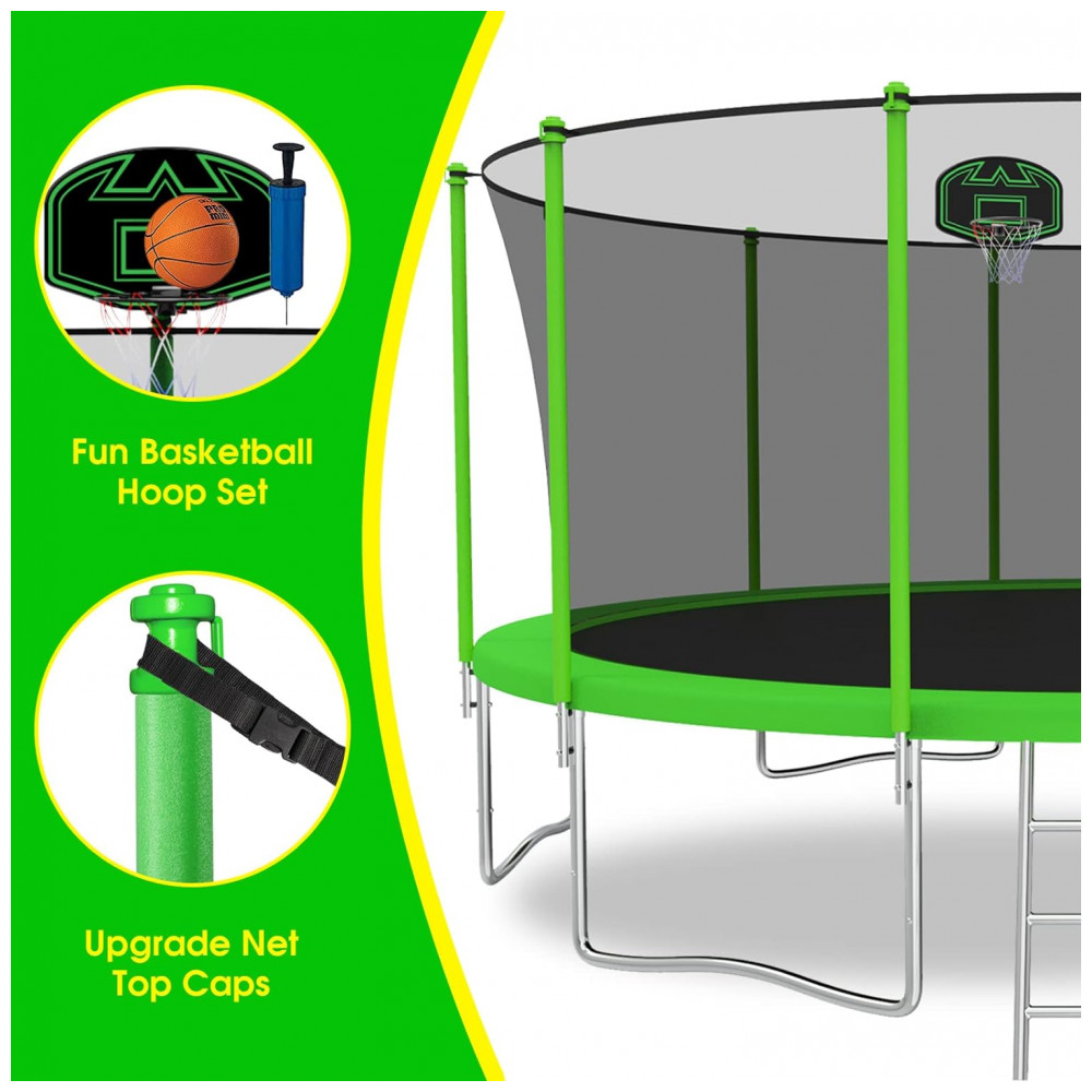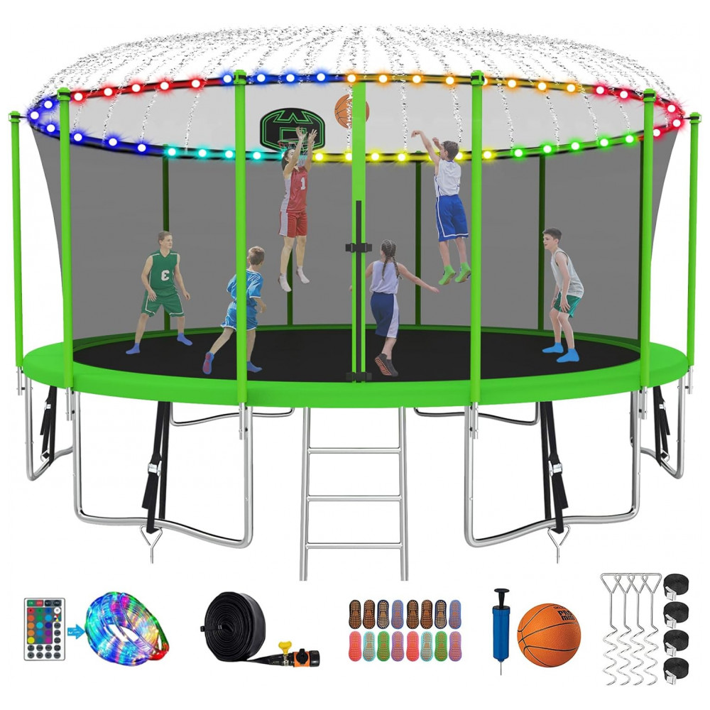 Trampolim redondo SKYUP verde com rede de proteção cesta de basquete luz LED aspersor de água meias e capacidade até 680kg