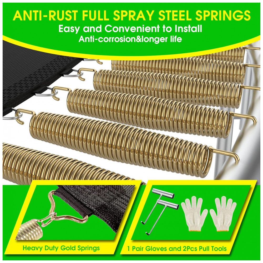 A área de salto é formada por lona em polipropileno conectada ao aro por 108 molas metálicas, com capa acolchoada periférica em espuma para cobertura das molas e bordas. A rede interna é fixada sem espaços entre a lona e a proteção, ajudando a conter os saltos dentro da área útil. O conjunto acompanha escada de acesso, kit de ancoragem para vento, cesta de basquete com bola, iluminação LED para o contorno do aro, aspersor de água e pares de meias para uso no trampolim, ampliando as possibilidades de brincadeira em diferentes condições de uso.