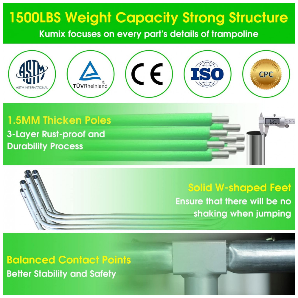 Certificações de segurança: Atende normas ASTM, CPC e CPSIA para trampolins recreativos, conforme descrição do fabricante