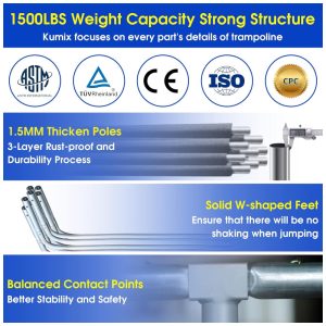 Trampolim resistente de 1500LBS Esta estrutura de trampolim de 16 pés é estruturada com postes de rede de segurança de 12 unidades, pernas em formato de 6 W e molas de 108 unidades, o que é raro de ver neste . O trampolim é grande e forte o suficiente para acomodar 8 a 10 crianças ou 3 a 6 adultos. Após vários testes de segurança e durabilidade mais de 2.000 vezes, nossos trampolins atendem totalmente a todos os tipos de padrões ASTM, CPC e CPSIA. Um trampolim mais sólido e faz com que você e seus filhos se sintam mais à vontade ao usá lo. Concentre se em todos os pontos detalhados Sem design de lacuna, a rede interna do gabinete de segurança é fixada de forma segura e estreita ao tapete de salto em toda a volta. Os tubos de aço galvanizado de 1, são tratados para evitar ferrugem, que é mais à prova de ferrugem e durável do que os tubos de aço comuns. As molas de aço com spray completo de são Mais forte, mais antiferrugem, anticorrosão e maior vida útil O conjunto de âncora de trampolim 4pcs pode reduzir suas perdas em climas de vento forte. Fácil de montar em 1 hora O trampolim pode ser instalado por 2 adultos em 1 2 horas de acordo com nosso manual gráfico detalhado. Todas as peças e etapas de instalação estão listadas e numeradas. As ferramentas de mola são fornecidas na embalagem. 100 sensação de realização durante a montagem do trampolim. O trampolim de design é definitivamente o melhor presente para as crianças pularem mais alto, crescerem mais rápido, ficarem longe de eletrônicos, queimarem a energia das crianças e permitirem que você aproveite seu próprio tempo. Pequenas mudanças, grande felicidade Trampolim de 16 pés com cesta de basquete vem com uma bola de plástico e bomba. Você pode jogar basquete em nosso trampolim a qualquer momento. 1x escada removível pode ser removível como você quiser. Você pode levá los embora quando não quiser que seus filhos brinquem. Presente ideal Não tem ideia de um ótimo presente de Natal para seus filhos O trampolim Kumix será uma grande surpresa para seus filhos. Não perca tempo se divertindo no trampolim. Não importa a ocasião, você pode se exercitar com ele e acompanhá lo. O trampolim é muito popular entre os 6 e os 40 anos. Crianças e adultos gostam do trampolim