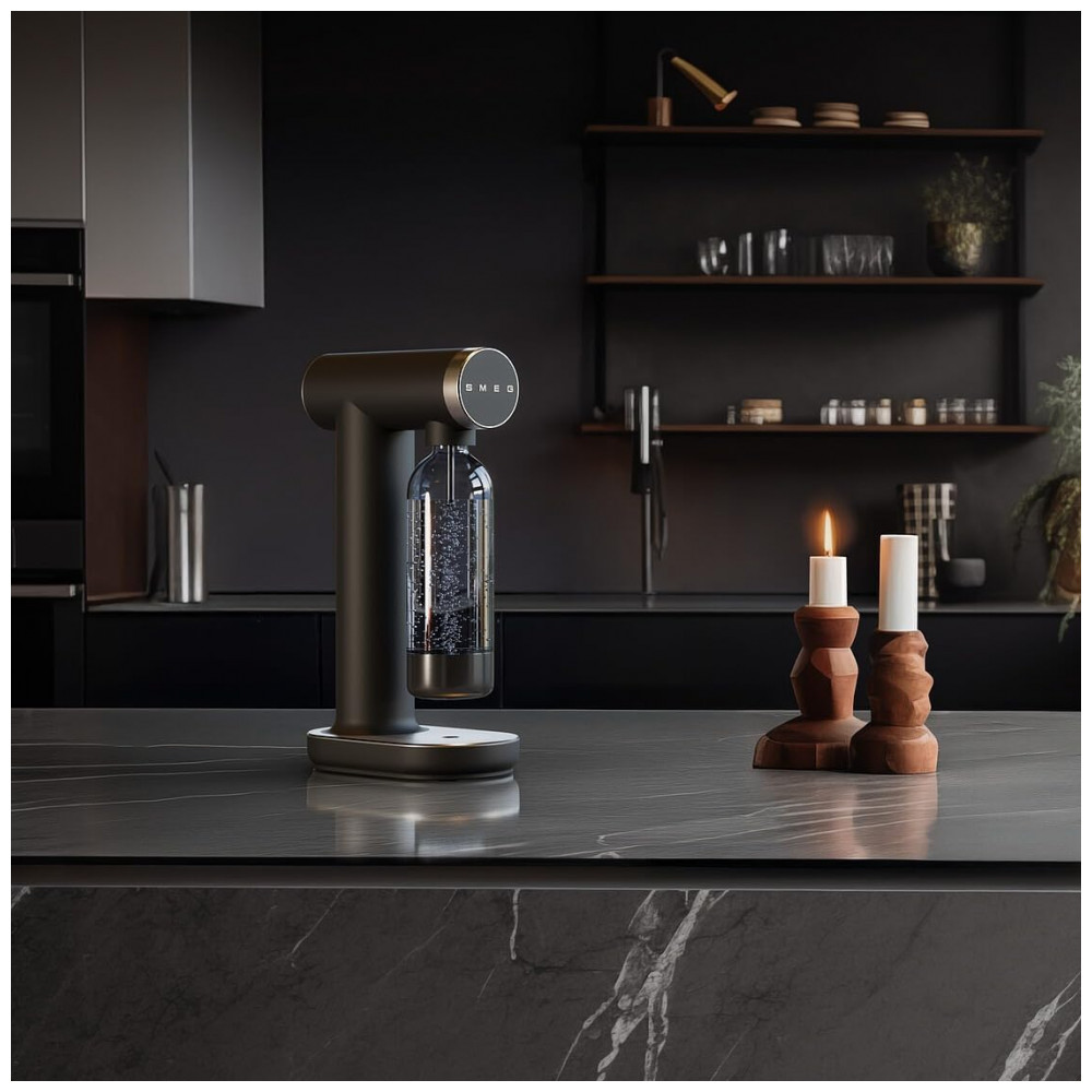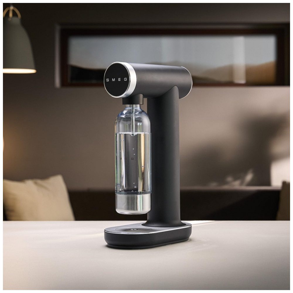 A SMEG Soda Maker é uma máquina de água com gás de bancada desenvolvida para gaseificar água de forma manual, com design da linha Collezione em acabamento preto fosco. O corpo combina alumínio, plástico e aço inox, resultando em um equipamento leve e resistente para uso frequente em cozinhas modernas, bares domésticos e escritórios.