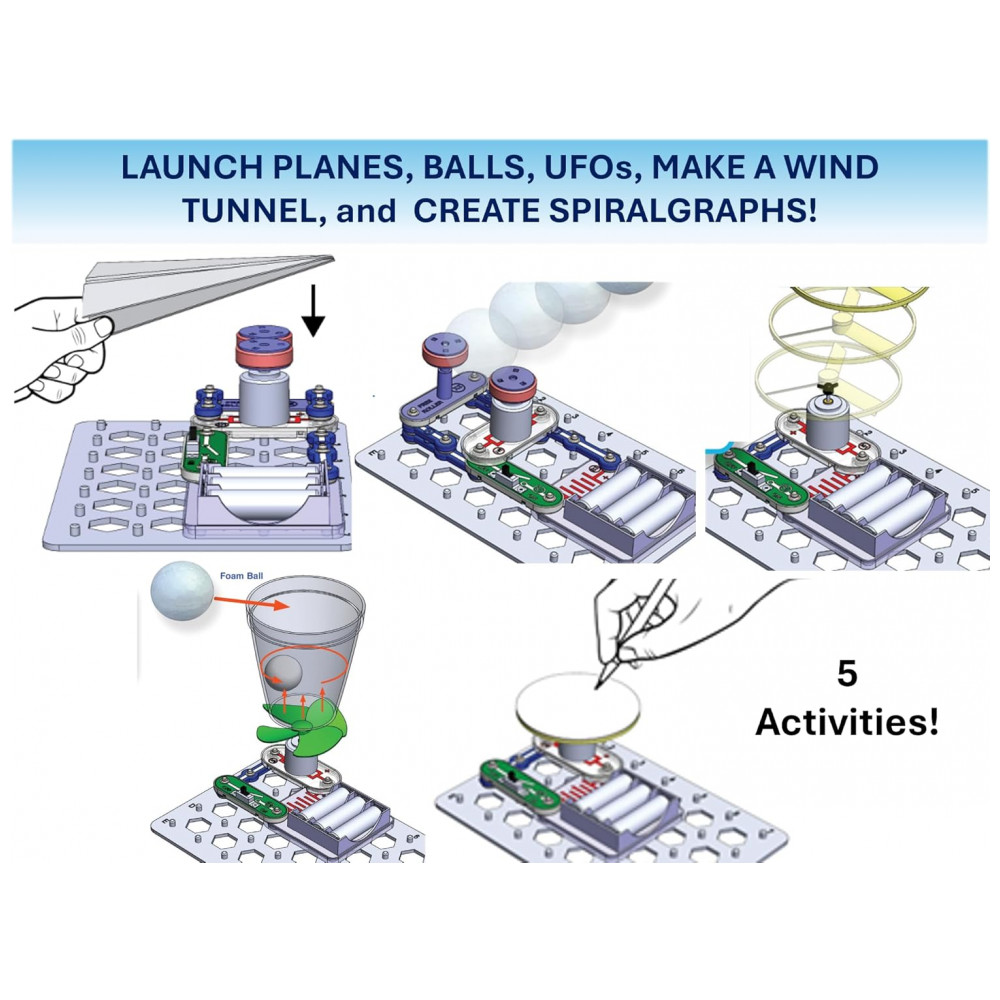 Este conjunto inclui diversos componentes eletrônicos modulares que se encaixam facilmente em uma base plástica, permitindo a construção de circuitos sem a necessidade de solda ou ferramentas. Os projetos variam desde o lançamento de aviões de papel e discos voadores até a criação de padrões artísticos em uma roda giratória e a levitação de bolas usando ar pressurizado, proporcionando uma experiência de aprendizado interativa.