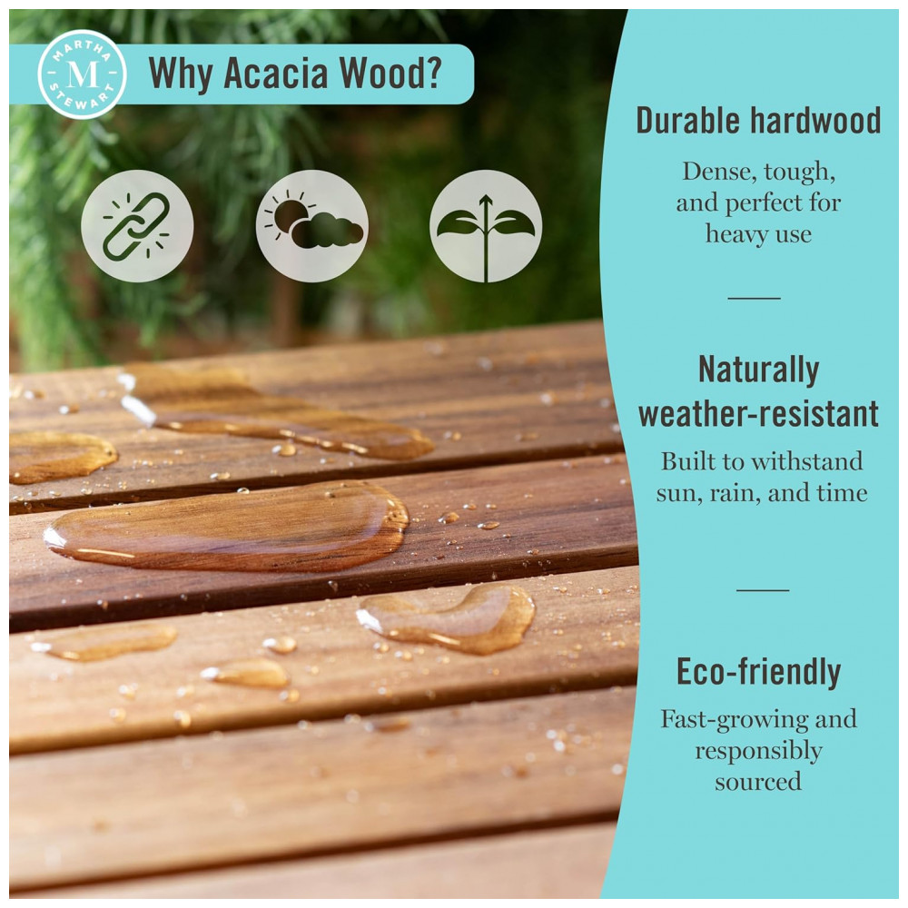 A estrutura é fabricada em madeira maciça de acácia, material reconhecido pela resistência natural às variações de clima, incidência de sol e umidade, o que favorece o uso em áreas externas ao longo do ano, desde que respeitados os cuidados de manutenção indicados pelo fabricante. O tampo da mesa oferece superfície retangular baixa para apoiar livros, lanches, jogos ou atividades de artes, funcionando como ponto central de apoio para o conjunto.