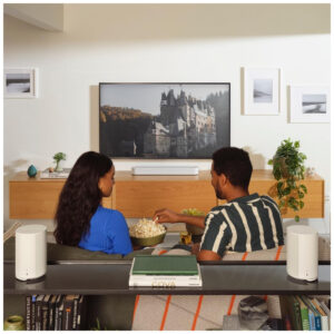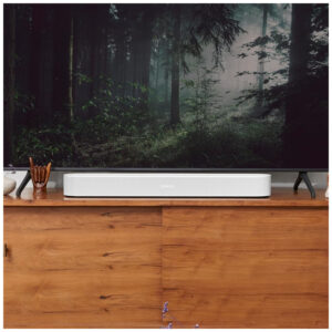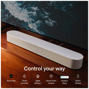 A soundbar traz um chip 40% mais rápido que a geração anterior, suporte para instalaçnao rápida, conectividade Wi-Fi e Apple AirPlay 2. Seu design compacto é ideal para ambientes menores, acompanhando TVs de até 60 polegadas, e o acabamento fosco branco oferece um visual sofisticado e clean.