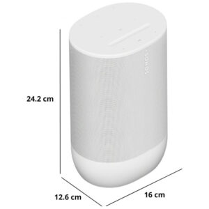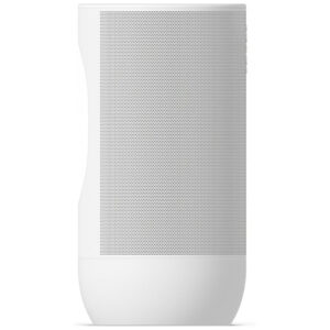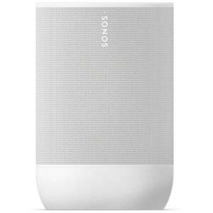 O Sonos Move branco é um alto-falante portátil inteligente com som estéreo rico e graves profundos, com resistência à água, poeira e quedas (IP56), ideal para uso indoor e outdoor. Possui bateria recarregável com até 24 horas de uso contínuo, carregamento sem fio e controle por voz com Alexa e Google Assistant integrados.