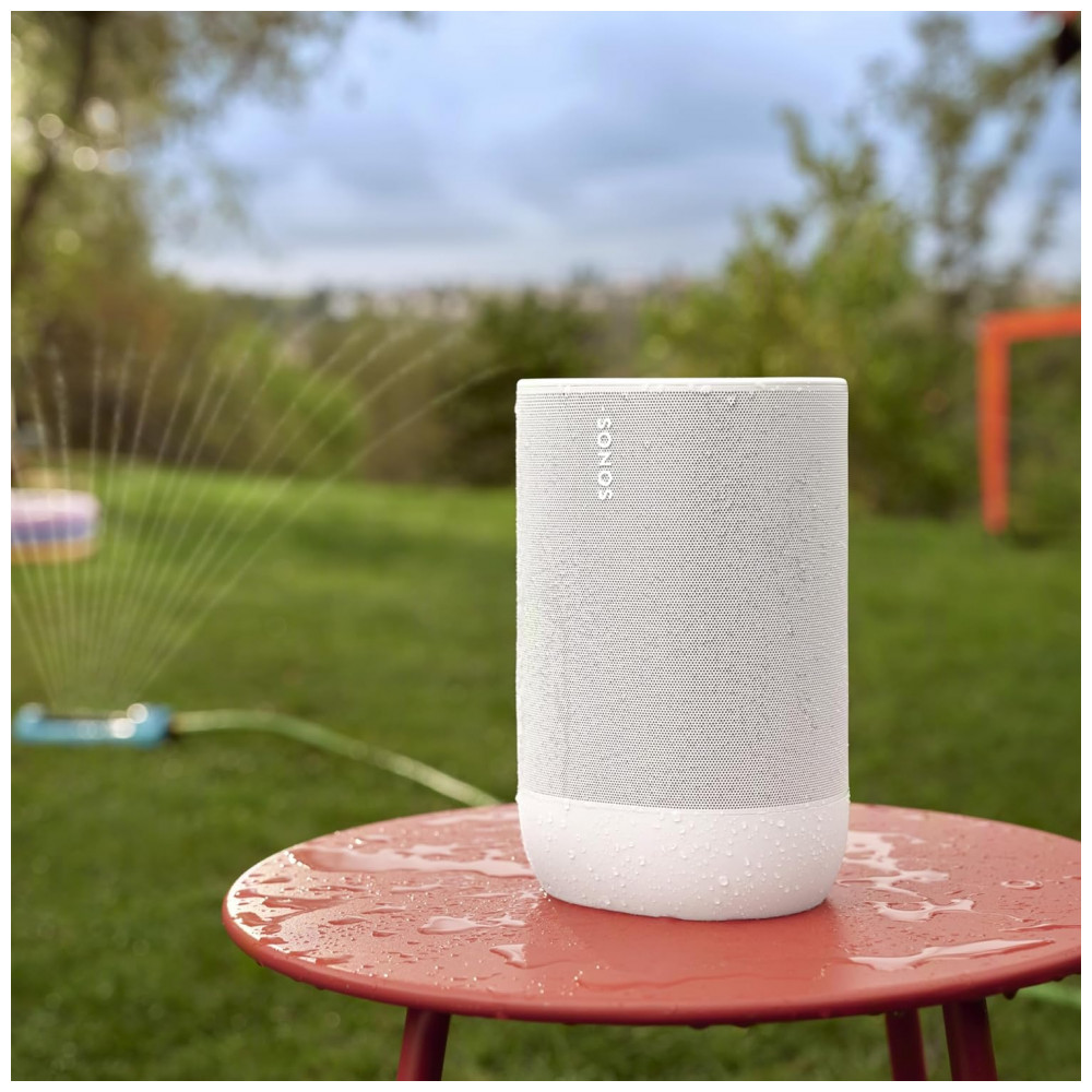 O Sonos Move branco é um alto-falante portátil inteligente com som estéreo rico e graves profundos, com resistência à água, poeira e quedas (IP56), ideal para uso indoor e outdoor. Possui bateria recarregável com até 24 horas de uso contínuo, carregamento sem fio e controle por voz com Alexa e Google Assistant integrados.