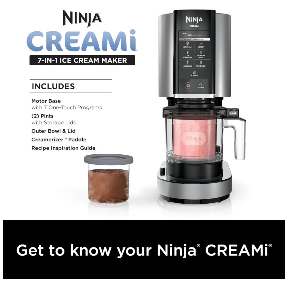 Componentes Incluídos: Guia de Inspiração de Receitas com 30 Receitas, Base do Motor com Motores de Acionamento Duplo, (2) Potes de 473 ml CREAMi com tampas de armazenamento, Tigela externa e tampa para acomodar o pote durante o processamento, Pá Creamerizadora