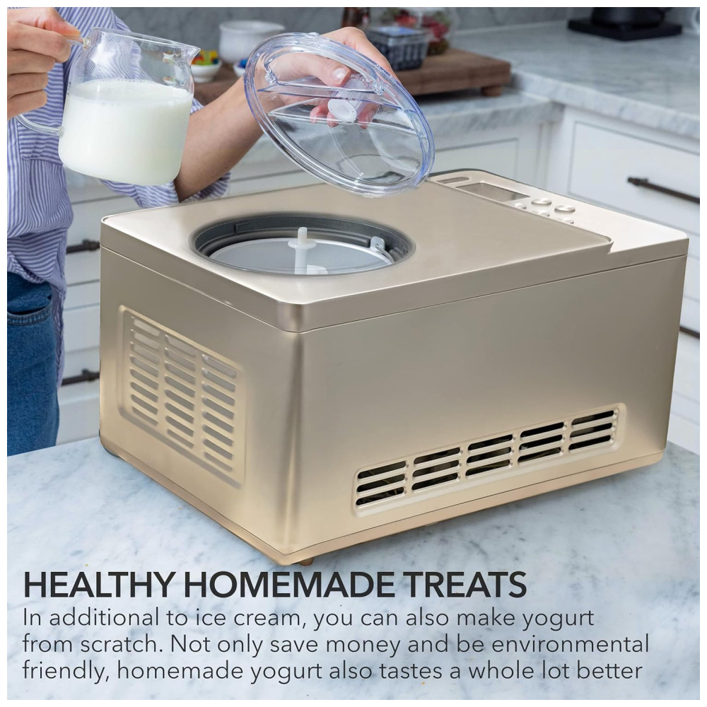 Cor Dourado Estilo Sorveteira Faça deliciosos sorvetes e iogurtes caseiros que você pode personalizar totalmente a seu gosto com a Máquina de Sorvete e Iogurte Whynter ICM 220CGY 2 Litros. Incrivelmente fácil de usar, você pode criar sorvetes deliciosos, gelato cremoso rico e sorbet, bem como iogurte natural fresco e saudável do estilo tradicional ao grego, usando ingredientes em que você confia no conforto da sua casa. Ideal para entretenimento, esta máquina de alta capacidade produz até dois litros de sua sobremesa favorita congelada ou estilo de iogurte em um único lote. A função de sorvete oferece funções premium e recursos não disponíveis em máquinas de orçamento. O poderoso congelador com compressor integrado permite o uso contínuo sem a inconveniência de ter que pré congelar o copo de mistura de aço inoxidável