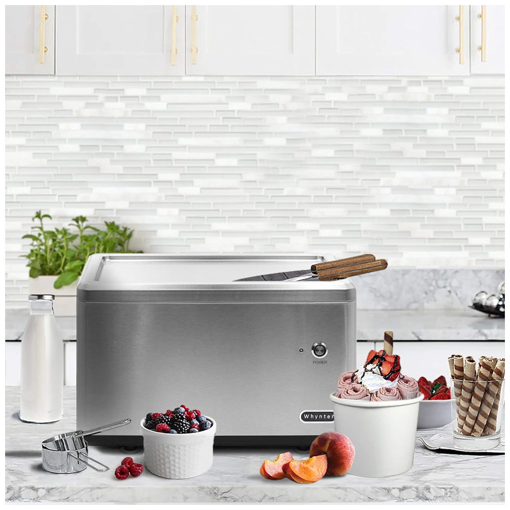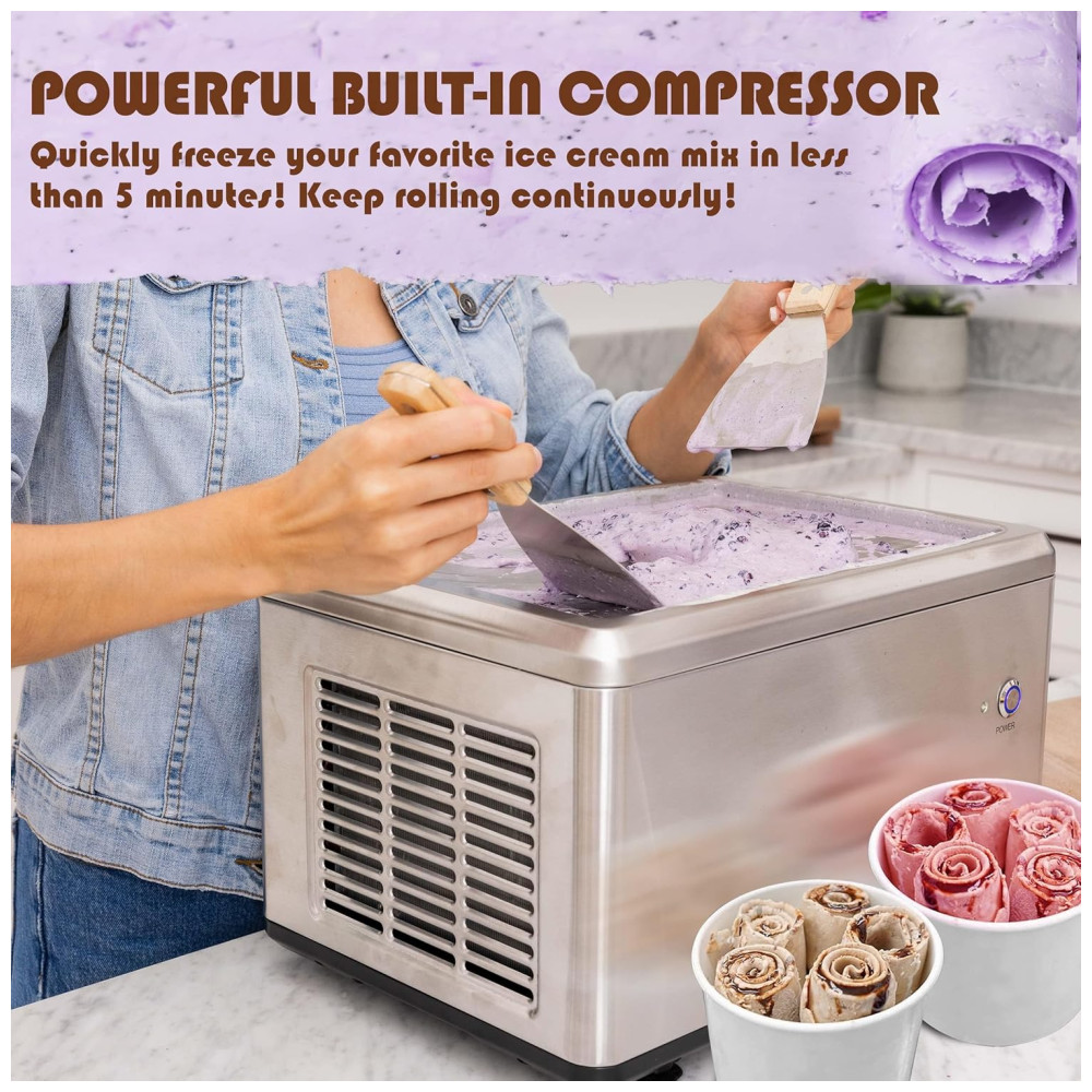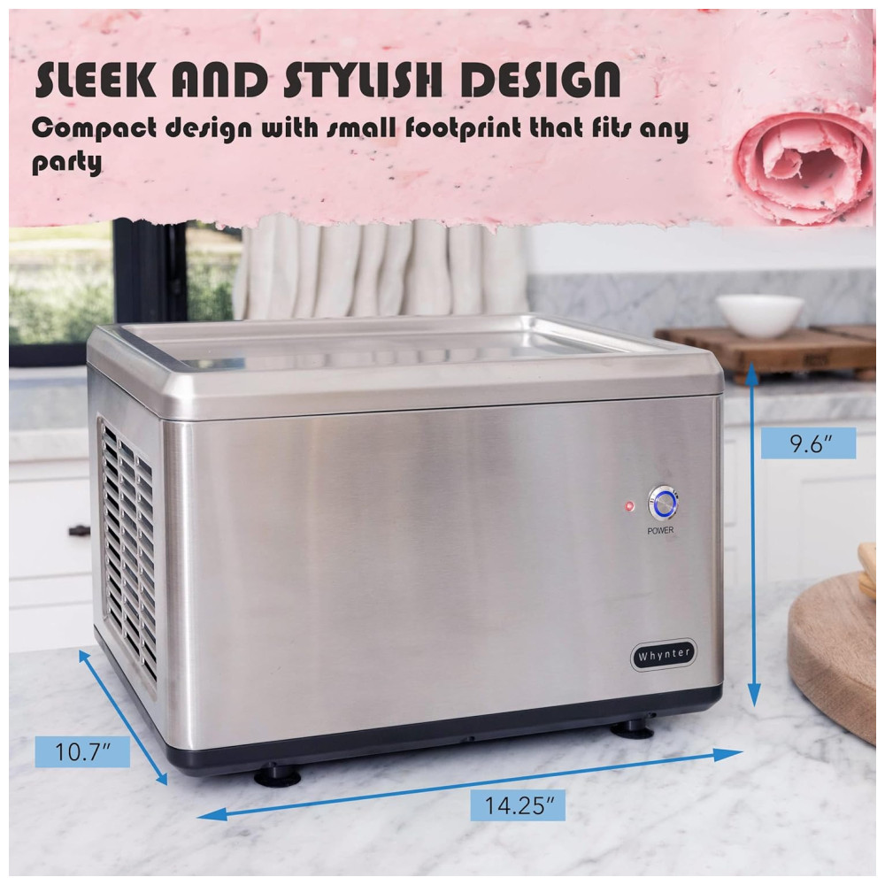Faça sobremesas como nunca antes Faça um delicioso sorvete caseiro que você pode personalizar totalmente a seu gosto no conforto da sua própria casa com a máquina de sorvete instantânea portátil Whynter ICR 300SS em aço inoxidável. O sorvete enrolado, também conhecido como sorvete frito, é feito mexendo os ingredientes em uma bandeja de gelo e simultaneamente resfriado a aproximadamente 12 graus C. O sorvete enrolado é picado e raspado enquanto é congelado em uma frigideira. Isso reduz a quantidade de ar preso dentro do sorvete tornando o sabor mais intenso. Esta sorveteira portátil com forma congelada oferece funções premium que uma máquina pode realizar em qualquer café ou loja de sobremesas. Um poderoso compressor de congelador integrado permite o uso contínuo e pode congelar rapidamente sua mistura de sorvete favorita em menos de 5 minutos Esta unidade inclui duas espátulas de aço inoxidável e 4 pernas de sucção para fornecer uma base mais sólida e estável