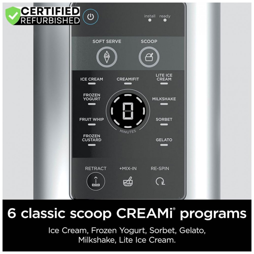 A máquina oferece 13 programas automáticos de um toque, incluindo 6 programas dedicados a soft serve, como soft serve, fruit whip, frozen custard, CreamiFit, frozen yogurt e opções de sobremesas mais leves. Esses ciclos ajustam tempo e padrão de rotação para diferentes tipos de receitas, permitindo adequar a textura à categoria de preparo escolhida.