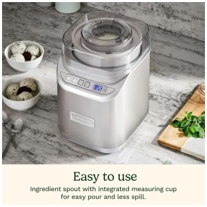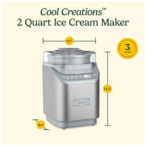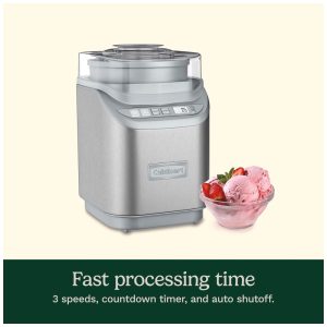 Produz 2 litros de sorvete, iogurte congelado, gelato ou sorvete, UC Cubic Feet Raquete aprimorada com tempo de processamento mais rápido Painel de controle com tela LCD e 3 configurações com várias velocidades Temporizador com desligamento automático. MC Cubic Feet 3.30 Bica de ingredientes com copo de medição integrado. O Fabricante de Sorvete Eletrônico Cuisinart faz 2 litros de sorvete em apenas 20 minutos A máquina inclui uma tampa com bico de ingrediente e copo medidor integrado, um freezer de 2 litros e uma pá aprimorada para um tempo de processamento mais rápido. A carcaça é um cromo escovado e elegante, com um display LCD simples com configurações de teclado para sorvete, gelato ou sorvete. Também é ótimo para fazer iogurte congelado A máquina possui até um temporizador de contagem regressiva e desliga automaticamente. Inclui instruções completas e uma seleção de receitas