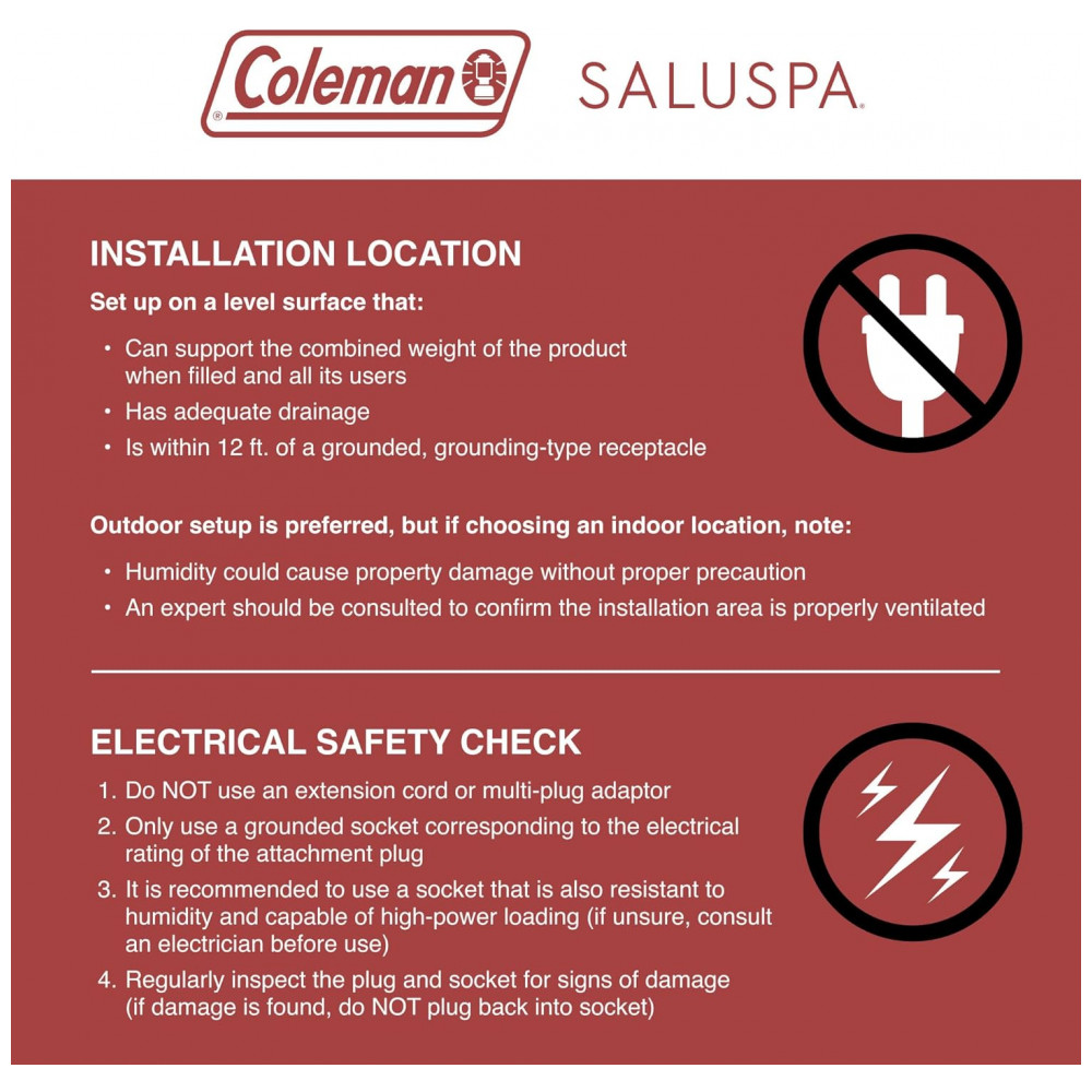Capacidade de água 80 preenchida: 840 litros Calor máximo: 40 graus Celsius Plugue de 3 pinos de 110, 120 volts Dimensões C x L x A: 180,34 x 180,34 x 71,12 centímetros NOTA: Este spa não pode ser em temperaturas inferiores a 4 graus Celsius