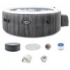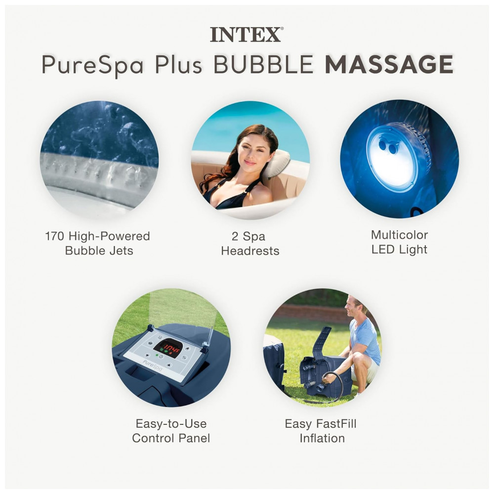 Inclui: Banheira, tampa, ventilador de aquecimento, filtração, ar, sistema de água dura, luz que muda de cor, 2 cartuchos de filtro, 2 apoios de cabeça, pano de chão, mangueira de inflação, bolsa de transporte, dispensador de cloro e tira de teste. Aproveite o seu spa com conforto e estilo