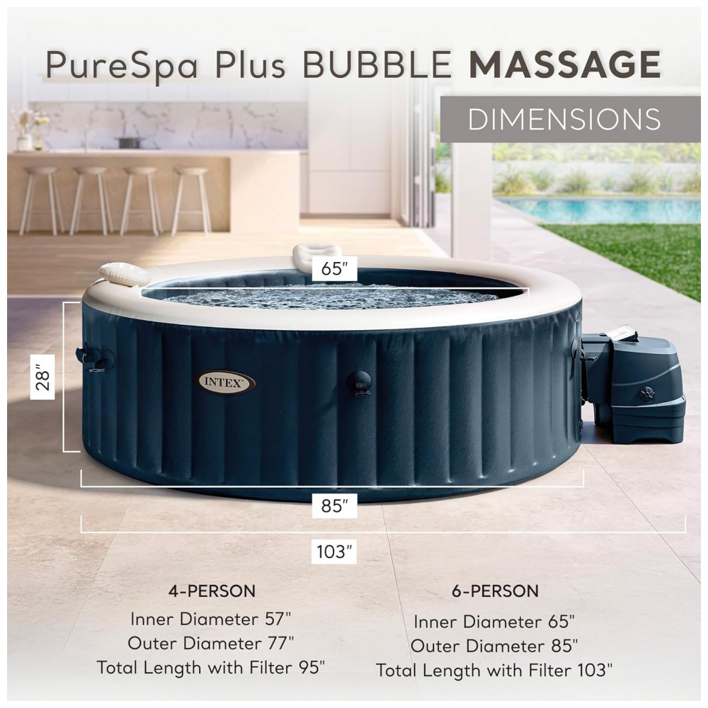 O spa com banheira de hidromassagem portátil e inflável para 6 pessoas permite que você relaxe com estilo com o toque de um botão Dimensões internas: Aproximadamente 165 x 165 x 71 centímetros Dimensões externas: Aproximadamente 216 x 216 x 71 centímetros.