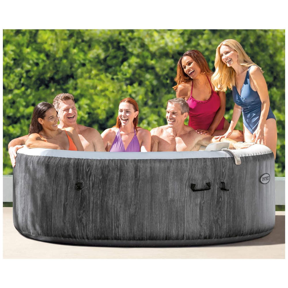 O spa espaçoso para banheira de hidromassagem inflável para 6 pessoas do modelo Intex 28441EP possui 140 jatos de alta potência e temperatura da água de até 104 graus Fahrenheit