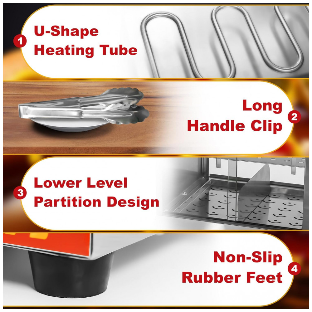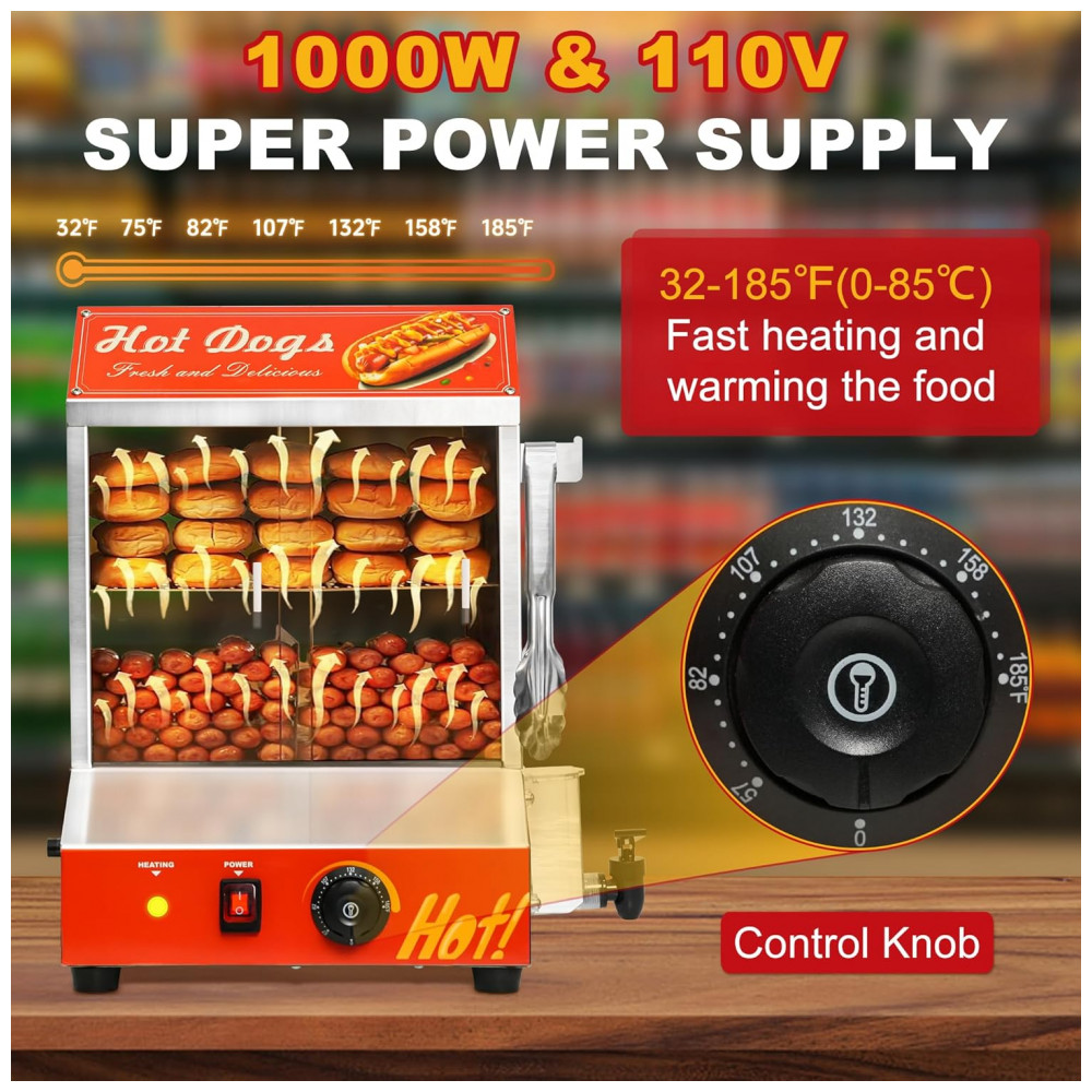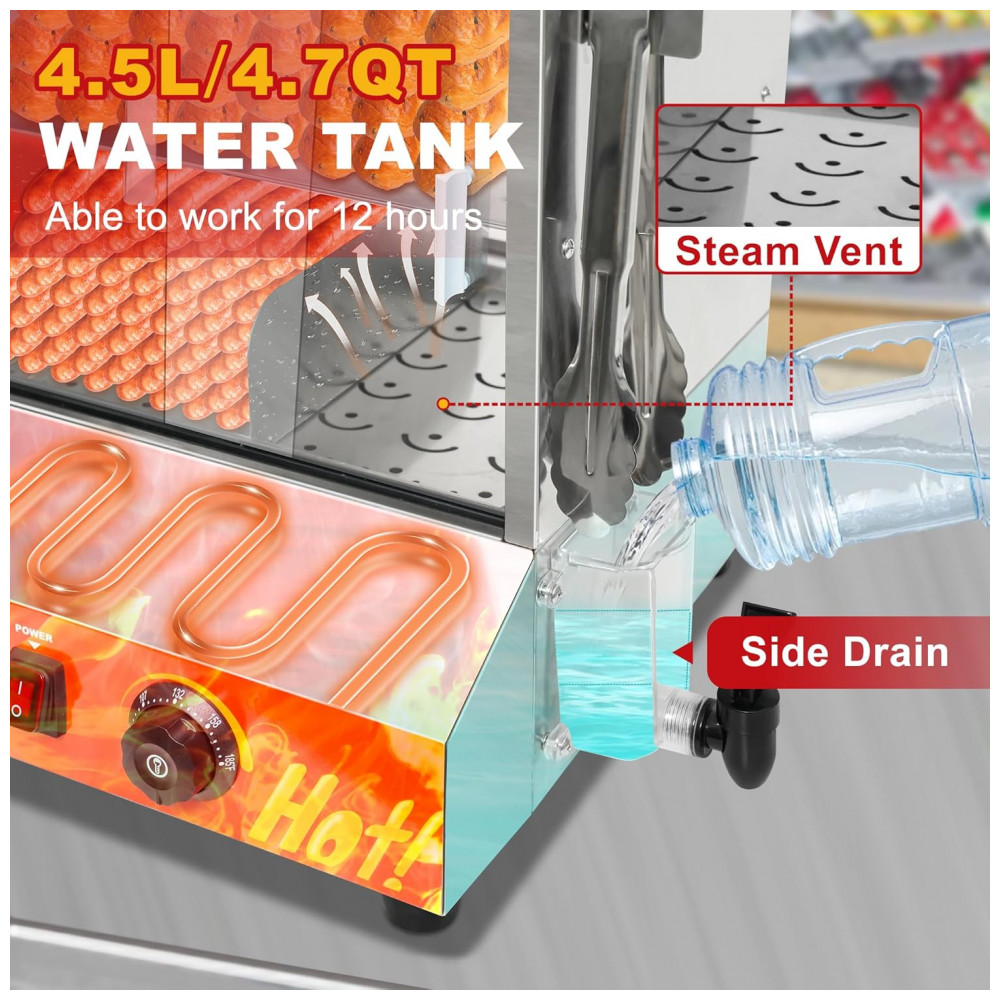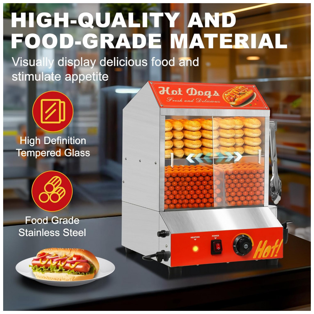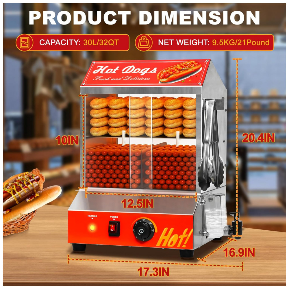 Desfrute de uma capacidade interna ampla com o Steamer de Cachorro-Quente e Aquecedor de Pão, que conta com 2 prateleiras para armazenar e aquecer cachorros-quentes e pães separadamente. Com dimensões de 44 x 43 x 52 cm, este equipamento pode acomodar cerca de 175 cachorros-quentes e 40 pães simultaneamente. Controle preciso de temperatura, variando de 0 a 85°C, mantendo os alimentos aquecidos e saborosos. O tanque de água de 4,5L elimina a necessidade de abastecimento frequente. Fabricado em aço inoxidável resistente, com vidro temperado espesso e resistente à ferrugem. Sistema de aquecimento U-tube para vapor uniforme, clipe de aço inoxidável, divisórias para empilhar os cachorros-quentes de forma organizada e 4 pés antiderrapantes. Além de cachorros-quentes, pães e salsichas, este steamer versátil pode ser usado em diversas ocasiões, como lojas de conveniência, cinemas e padarias.