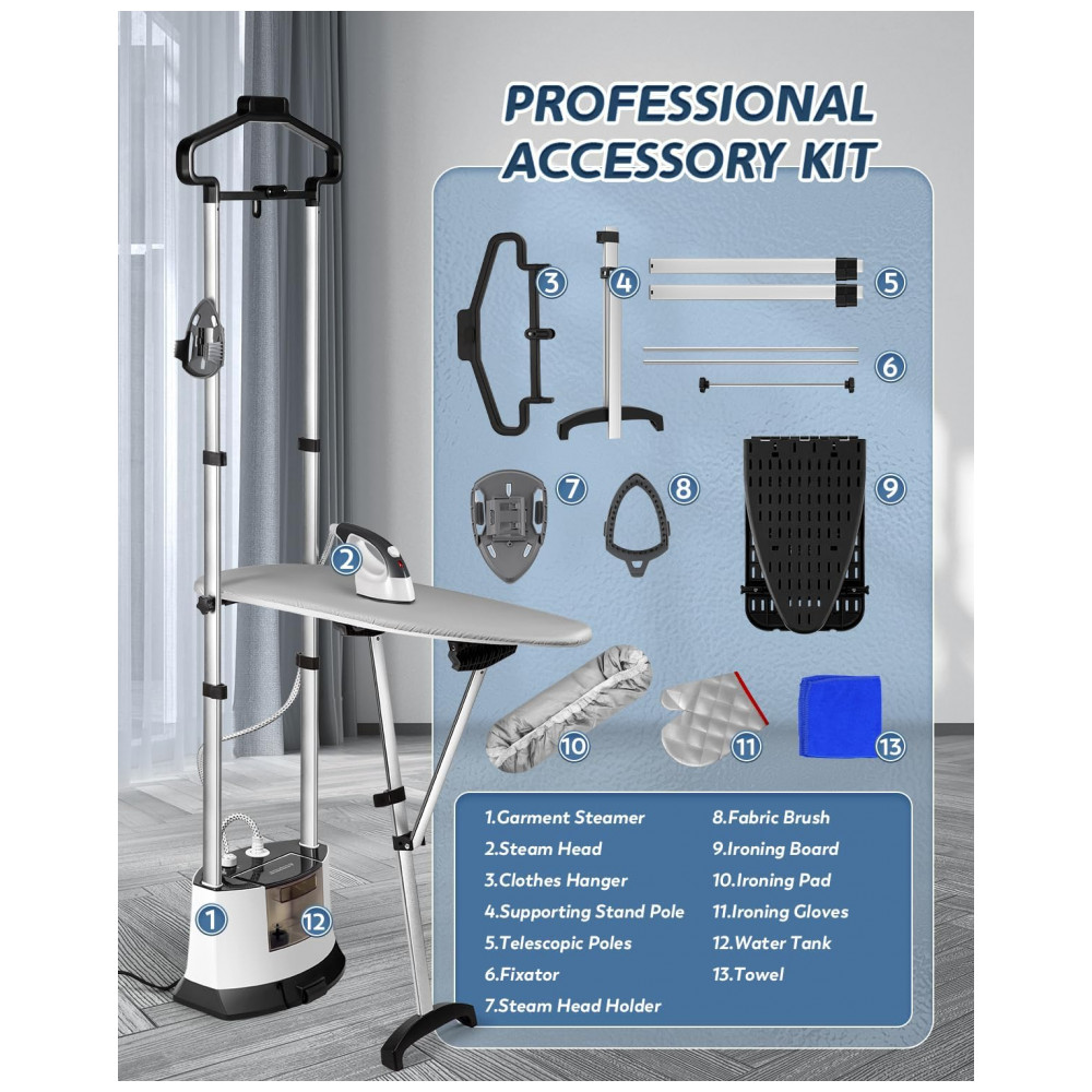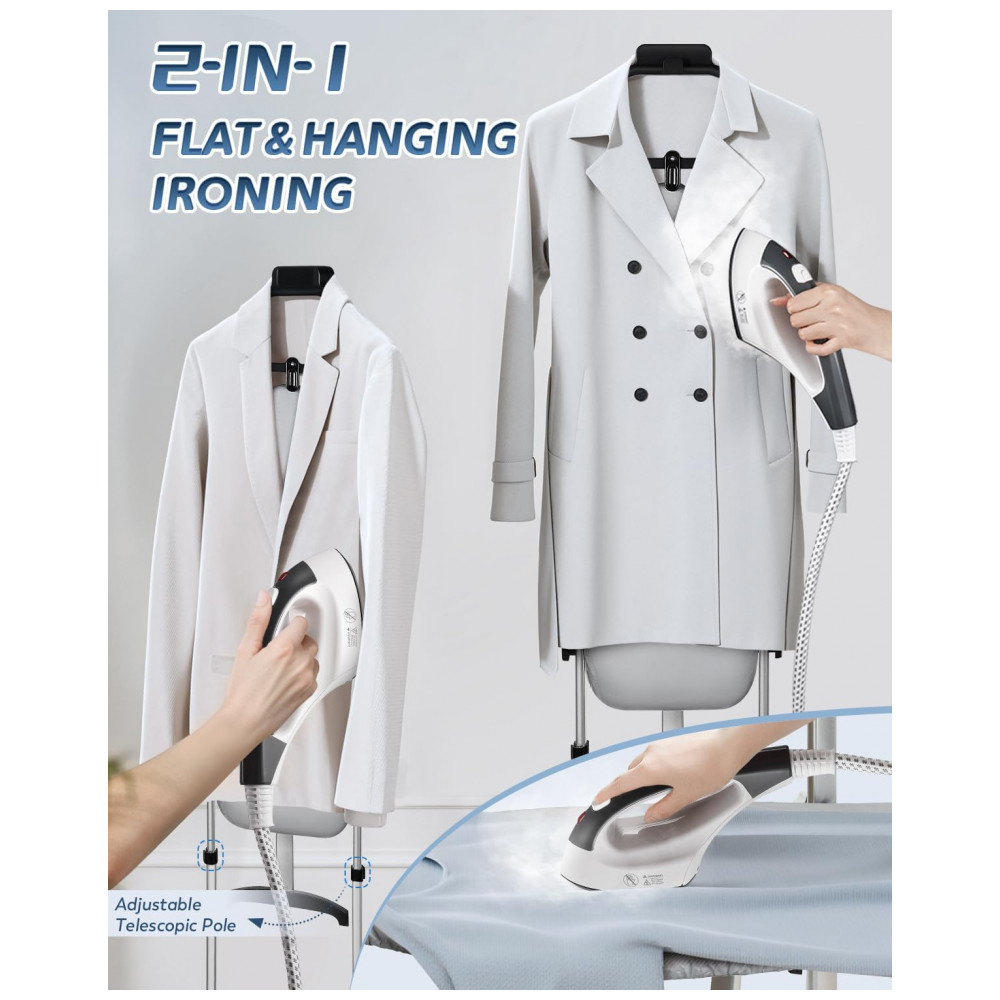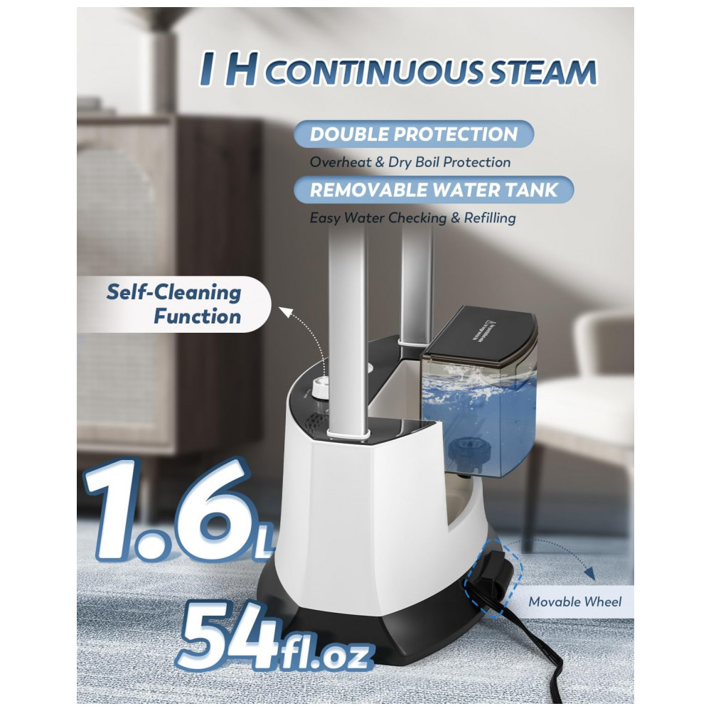 A tecnologia de vapor pulsado de 1500W oferece aquecimento rápido em apenas 25 segundos, proporcionando potente vapor de 45g/minuto. O vapor pulsado penetra profundamente nas fibras do tecido para remover rugas de forma rápida, reduzindo o consumo de água. Com eficiência superior, atua como um limpador de alta pressão, superando os vaporizadores comuns. A tecnologia de infusão de vapor em três camadas amacia as fibras do tecido, relaxando as rugas de dentro para fora, resultando em suavidade duradoura. O vapor seco nanoatomizado evita gotejamento e não danifica as roupas, sendo adequado para diferentes necessidades de cuidado com tecidos. Com função de autolimpeza e proteção contra superaquecimento/água, o vaporizador vertical previne acúmulo de resíduos, mantendo o fluxo de vapor constante. Além disso, possui sistema de proteção contra falta de água/superaquecimento, desligando automaticamente em caso de baixo nível de água ou temperatura superior a 148°C. O tanque de 1,6L proporciona 1 hora de vapor potente, eliminando recargas frequentes. Com três níveis de vapor ajustáveis para todos os tecidos, de camisas e calças a cortinas e colchões, oferece remoção profissional de rugas. A função de vapor pode ser desligada para passar a seco, superando o ferro tradicional. O vaporizador de roupas vertical 2 em 1 combina funções de pendurar e passar a ferro em superfície plana. O mastro telescópico, tábua de passar e cabide permitem alternar facilmente entre os modos. Possui design dobrável e rodas de deslizamento suave para armazenamento que economiza espaço. Acessórios profissionais, qualidade excelente. Certificado CE, CB, ROHS, ETLCETL, atendendo aos padrões de segurança e qualidade profissional. Durável e confiável. Não perca tempo e adquira já o seu!