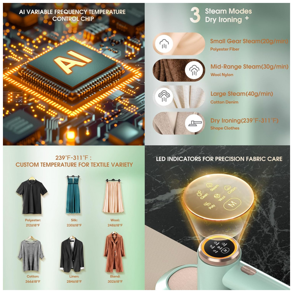 O Ferro de Passar Estação a Vapor Profissional Newbealer Pro apresenta um sistema potente de 1550W, aquecendo em apenas 30 segundos e utilizando a avançada tecnologia de vapor PSA com 3 configurações, proporcionando até 40g/min de vapor. Com um tanque removível de 1,2L para 40 minutos de vaporização, a remoção de rugas se torna rápida e sem esforço, elevando a sua rotina de passar roupa. Esse ferro 2 em 1 versátil se destaca tanto na passagem horizontal quanto na vertical, com um design antiderramamento 360. Use-o como ferro a vapor ou seco. A leve alça ergonômica de 1,7lb, a Base de Cerâmica de Diamante e a flexibilidade de rotação de 90 graus o tornam um aliado doméstico indispensável. Perfeito para residências modernas, este vaporizador de mão oferece opções flexíveis de pendurar com um gancho e montagem na parede, ideal para varandas, entradas ou armários. Seu design economizador de espaço garante uma experiência de passar roupa sem bagunça e mescla-se perfeitamente em qualquer ambiente para um armazenamento fácil. Modos de Vapor Seco Avançados e Recursos de Segurança de Cuidado de Tecido: Grau Comercial para Casa, Hotel Boutique. Três modos de vapor/seco 100°C-170°C lidam com sedas delicadas de butique a lençóis pesados de hotel. A tela de LED auxilia na seleção, enquanto recursos de segurança como desligamento automático de 10 minutos, Trava de Segurança, Base Antiescaldo e Interruptores Independentes garantem uma experiência de passar roupa confiável e segura. A função de Autolimpeza em um só passo melhora a durabilidade. Design Elegante e Multifuncional para Toda a Família: Este vaporizador premium, completo com um funil de silicone, kit de montagem na parede e manual do usuário, possui um design elegante que simplifica a passagem de roupas para todas as peças da família. Sua multifuncionalidade e aparência elegante o tornam uma adição impressionante a qualquer lar, mantendo a elegância do guarda-roupa durante todo o ano.