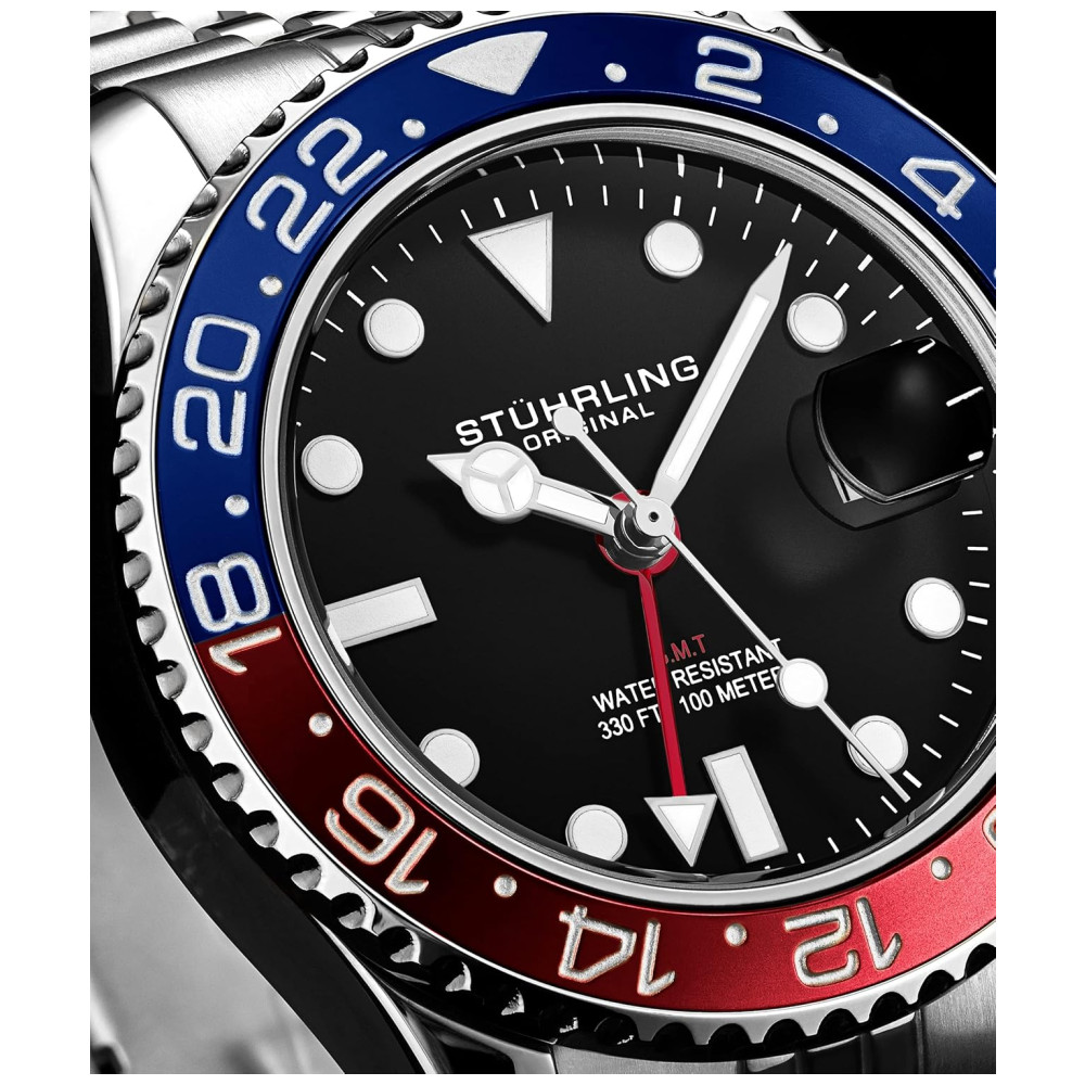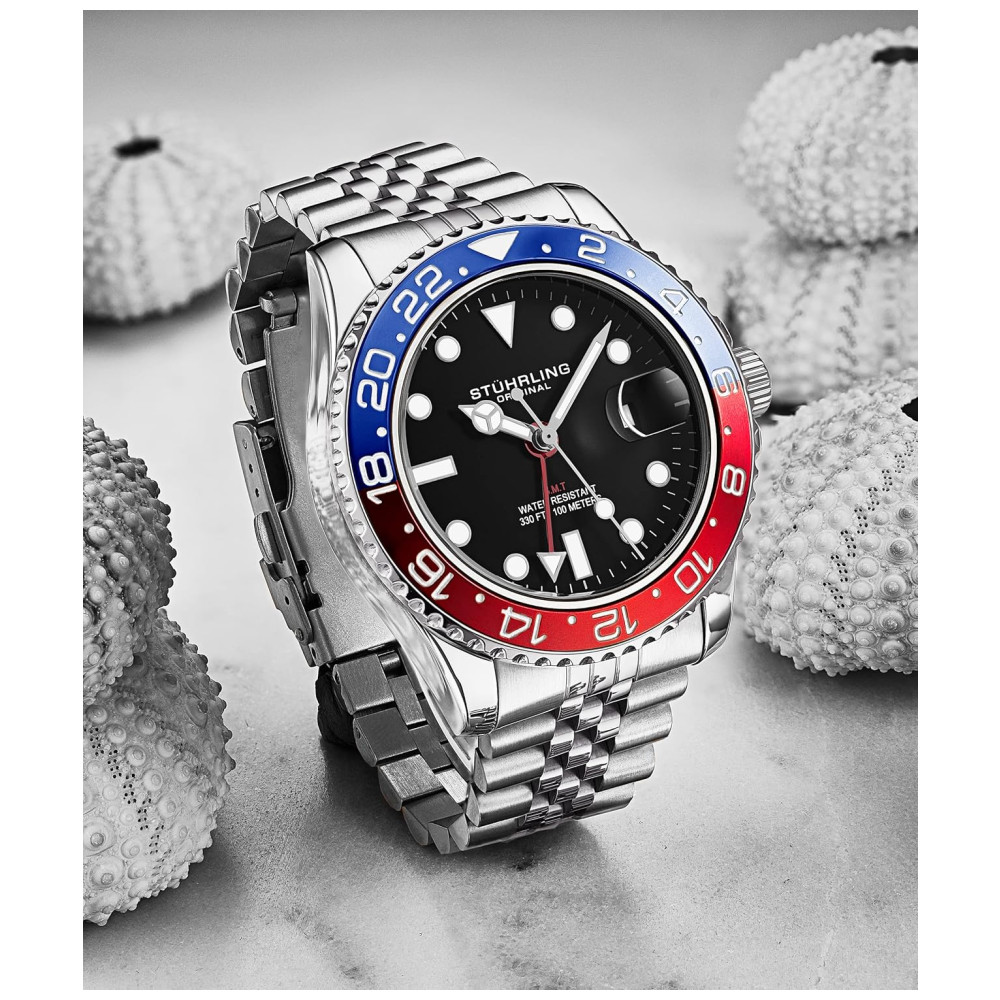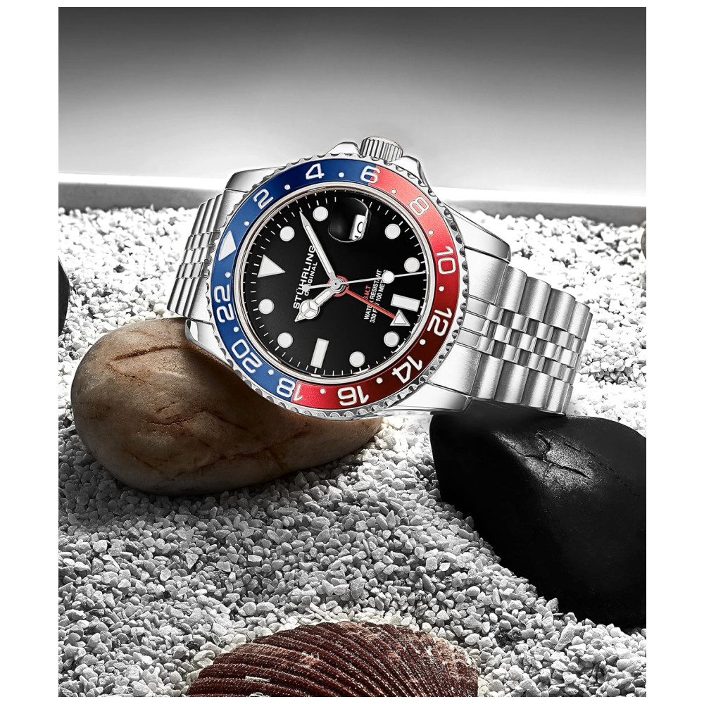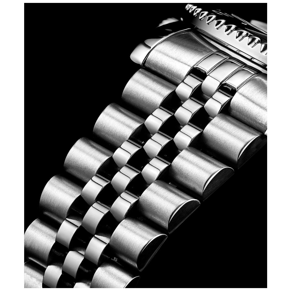 Ponteiros e índices luminescentes de fácil leitura, coletados em uma luneta de borda de moeda. GMT dupla hora rastreia outro fuso horário com o ponteiro dos segundos e a moldura externa Bracelete de ligação em aço inoxidável jubileu totalmente ajustável com fecho de segurança com botão de disparo. Resistente à água até 100 metros.