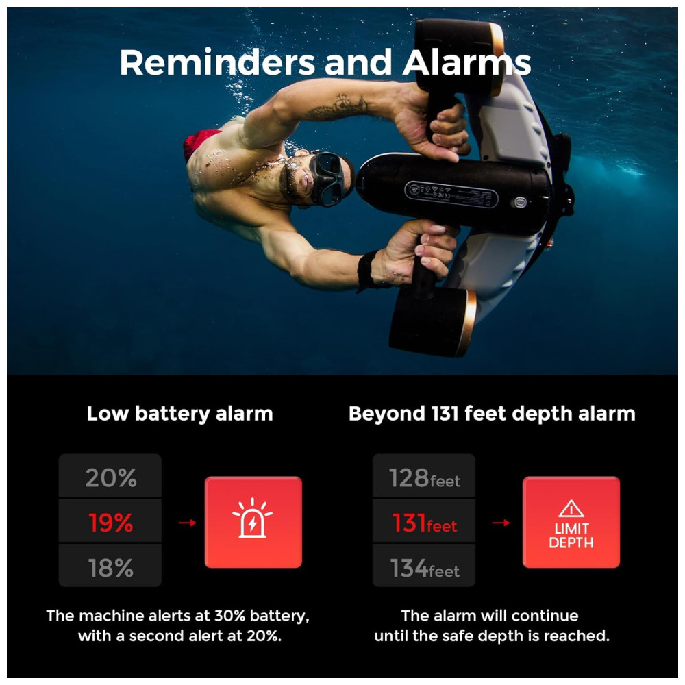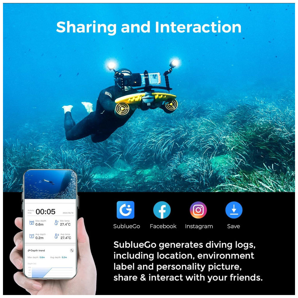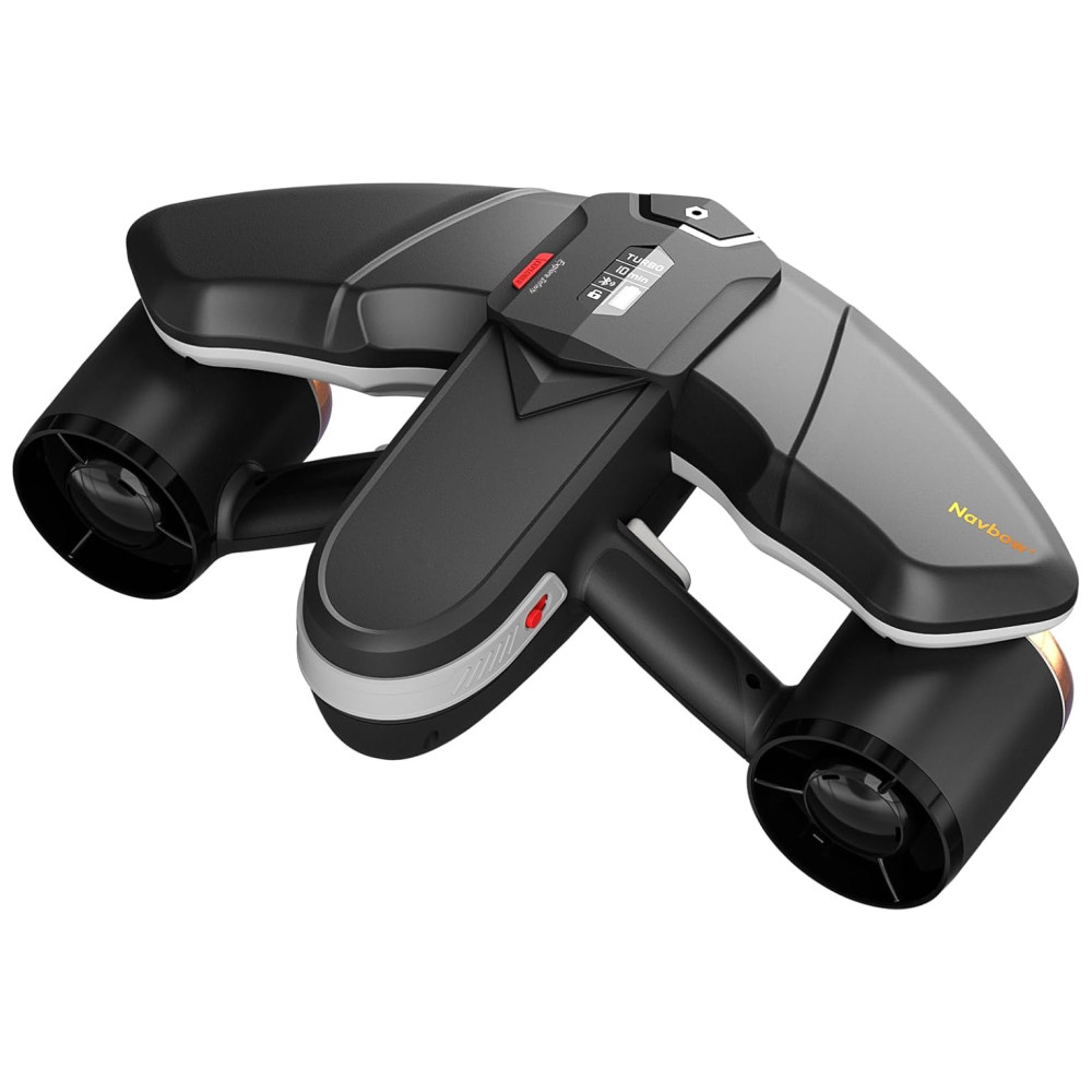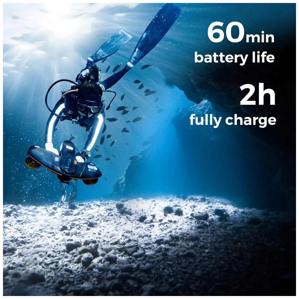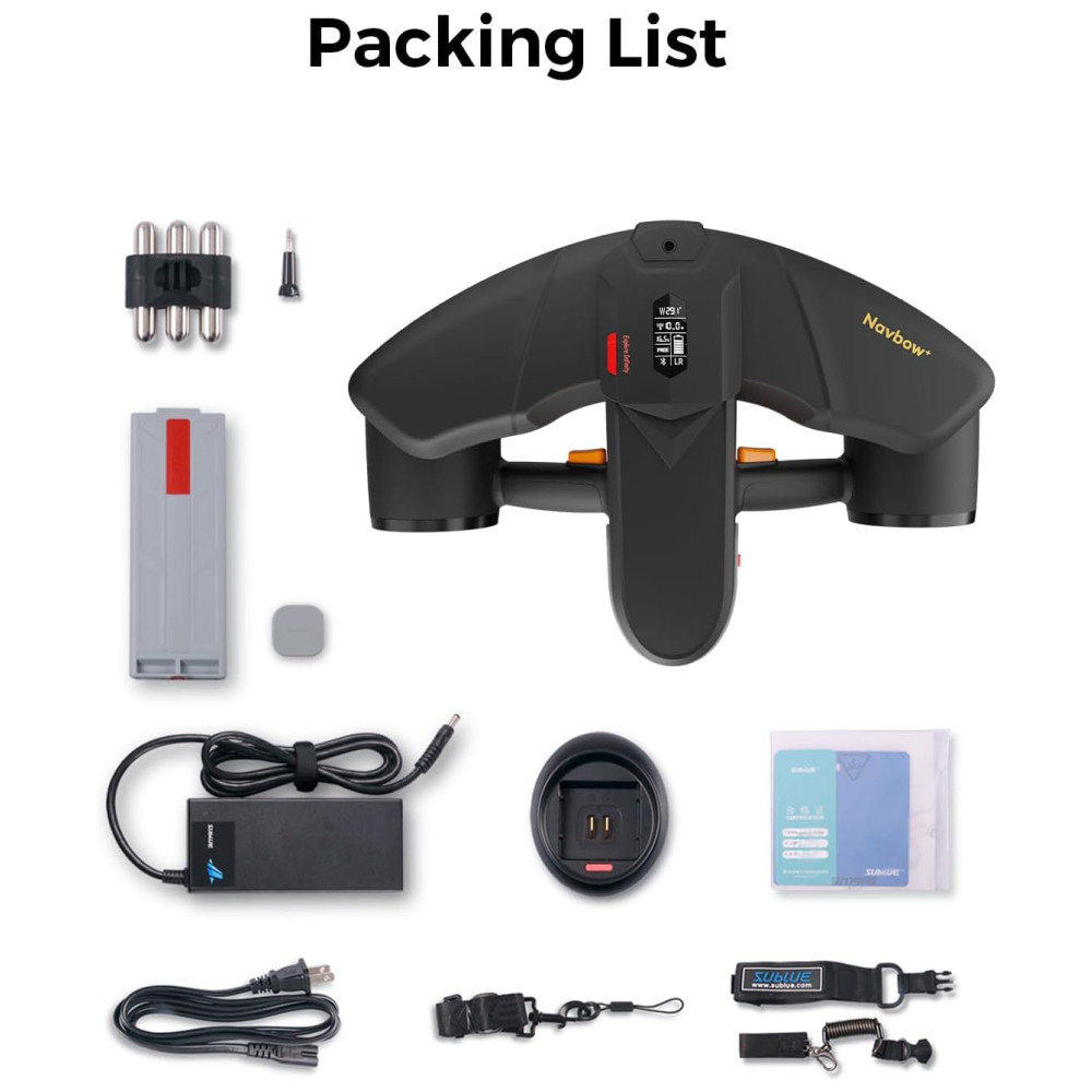 O Navbow Plus da Sublue é um scooter subaquático de alta performance, com 3 modos de velocidade: FREE (2.24 mph), SPORT (3.36 mph) e TURBO (4.47 mph). Equipado com dois motores que fornecem impulso, capaz de puxar várias pessoas. Com autonomia de até 60 minutos, tela OLED para monitorar temperatura, profundidade, bateria e mais. Possui sensores de profundidade, temperatura, bússola digital e personalização de parâmetros de segurança via app. Registre e compartilhe seus mergulhos com facilidade. Feito de Fibra de Carbono, o Navbow Plus é ideal para adultos de ambos os sexos.