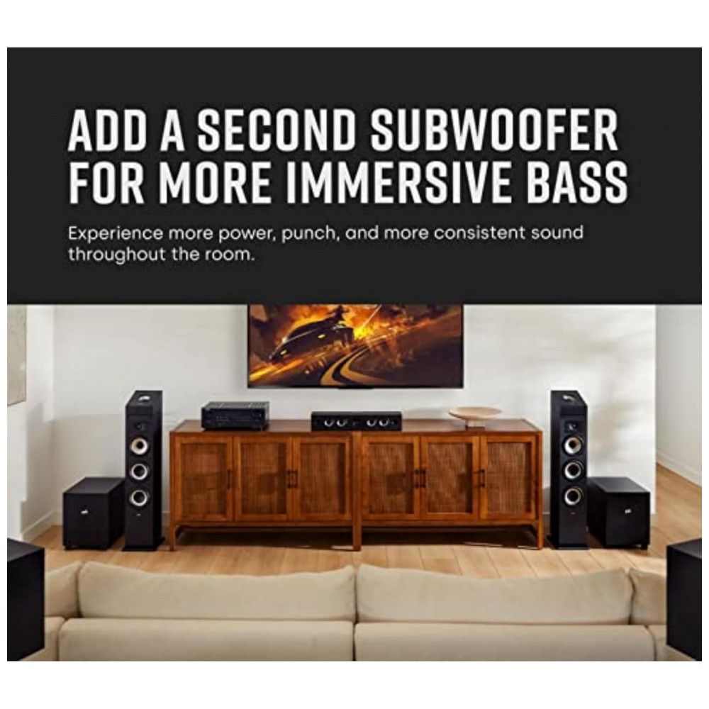 O gabinete em MDF com projeto bass reflex de saída voltada para baixo é rigidamente reforçado para reduzir ressonâncias indesejadas e interferências sonoras. O painel traseiro oferece controles de volume, frequência de corte variável e fase, permitindo ajustar o subwoofer ao ambiente e ao conjunto de caixas principais, além de entradas de linha e LFE compatíveis com receivers Dolby Atmos, DTS:X e Auro 3D.