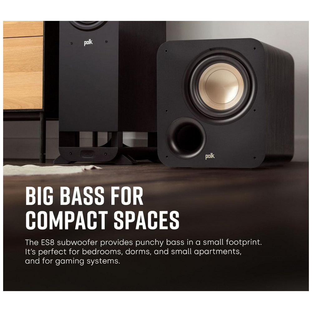 O subwoofer ativo Polk Audio Signature Elite ES8 foi projetado para reforçar graves em sistemas de home theater e música, oferecendo baixa frequência com boa definição em ambientes pequenos e médios. Com amplificador Classe D de 100W integrado e arquitetura frontal bass‑reflex, ele expande a resposta de grave do sistema sem exigir grande volume de instalação.