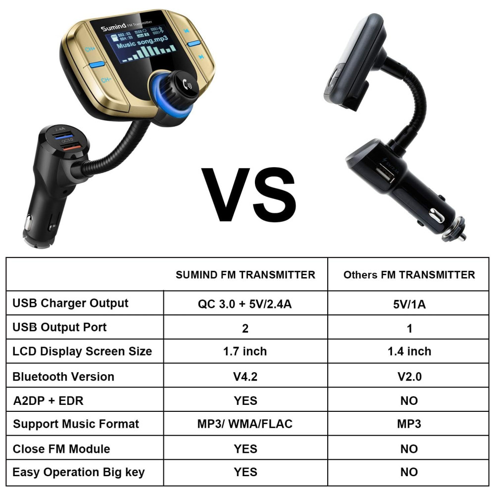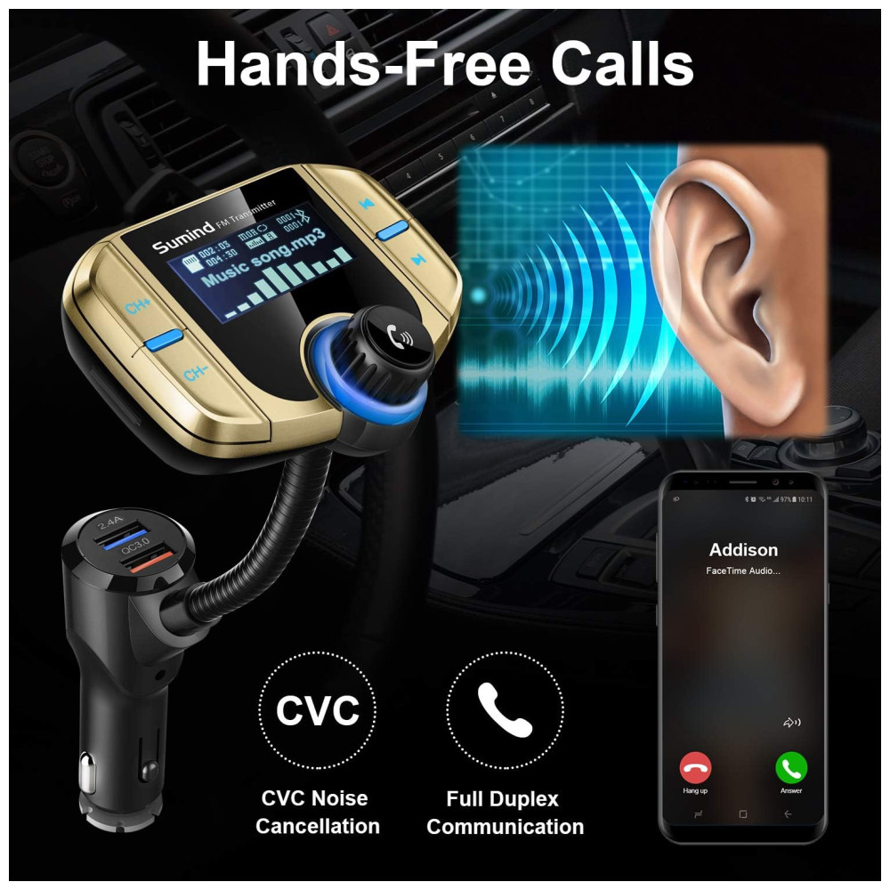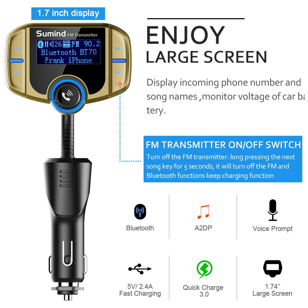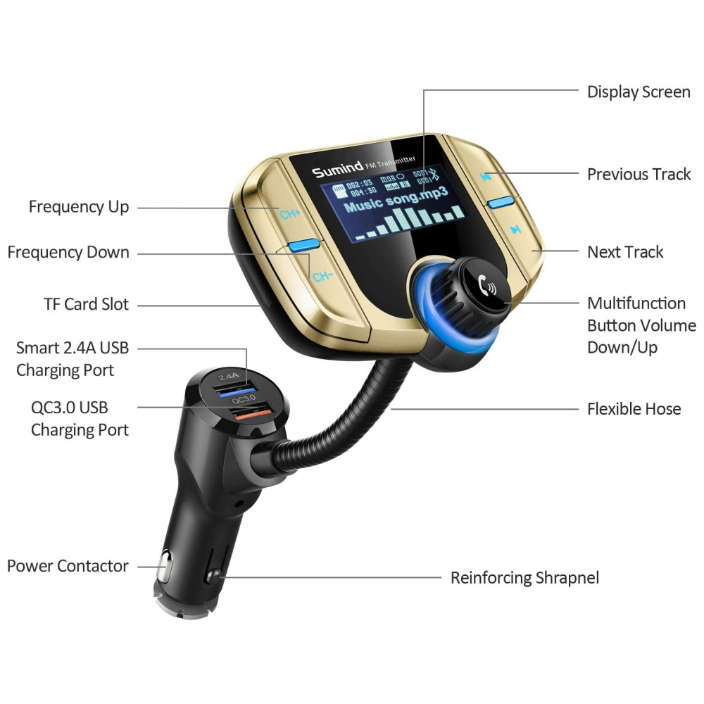 Desenho especial chave grande para fácil operação grande display LCD backlight nome da música , número de telefone de entrada e mostra o nível da bateria do seu carro quando o carro liga Pode girar a tela do visor LCD em pescoço de ganso de 270 graus para um conforto de visualização ideal Desligue o transmissor FM pressionando longamente a próxima tecla de música por 5 segundos, ele desligará o FM e as funções manterão a função de carregamento