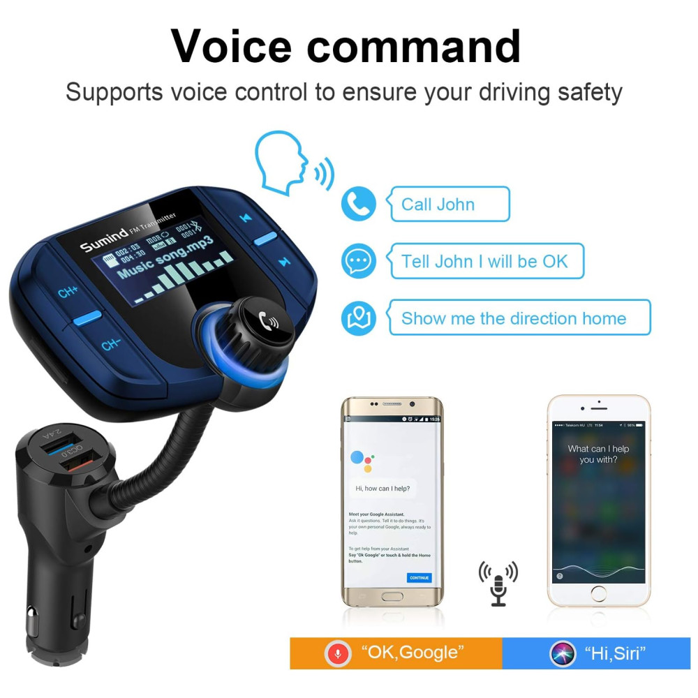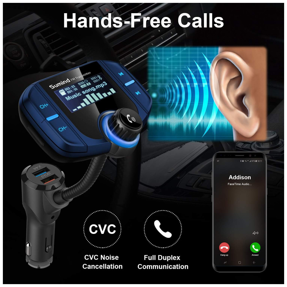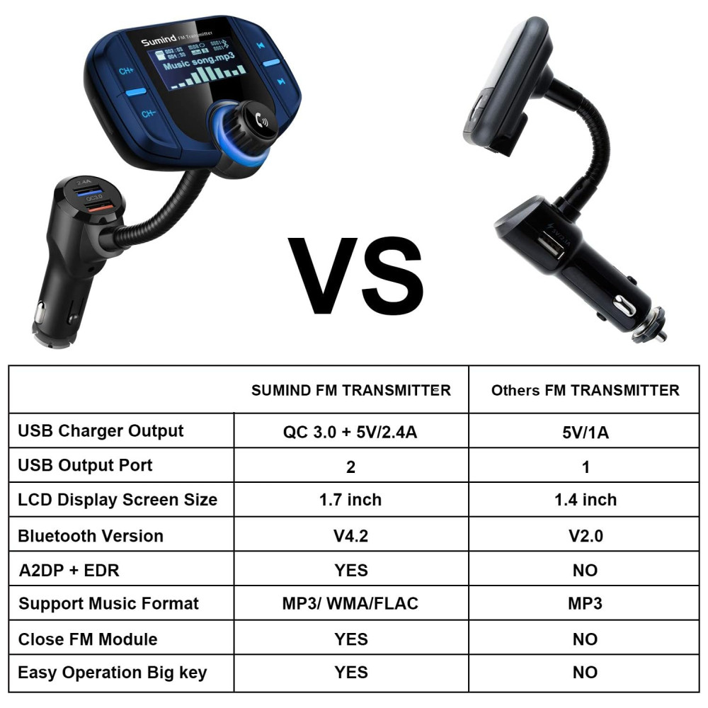 Desenho especial chave grande para fácil operação grande luz de fundo LCD exibe o nome da música , número de telefone de entrada e mostra o nível da bateria do seu carro quando o carro liga Pode girar a tela do visor LCD em pescoço de ganso de 270 graus para um conforto de visualização ideal Desligue o transmissor FM pressionando longamente a próxima tecla de música por 5 segundos, ele desligará o FM e as funções manterão a função de carregamento