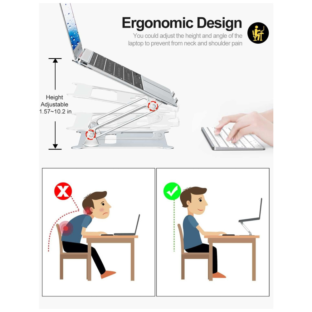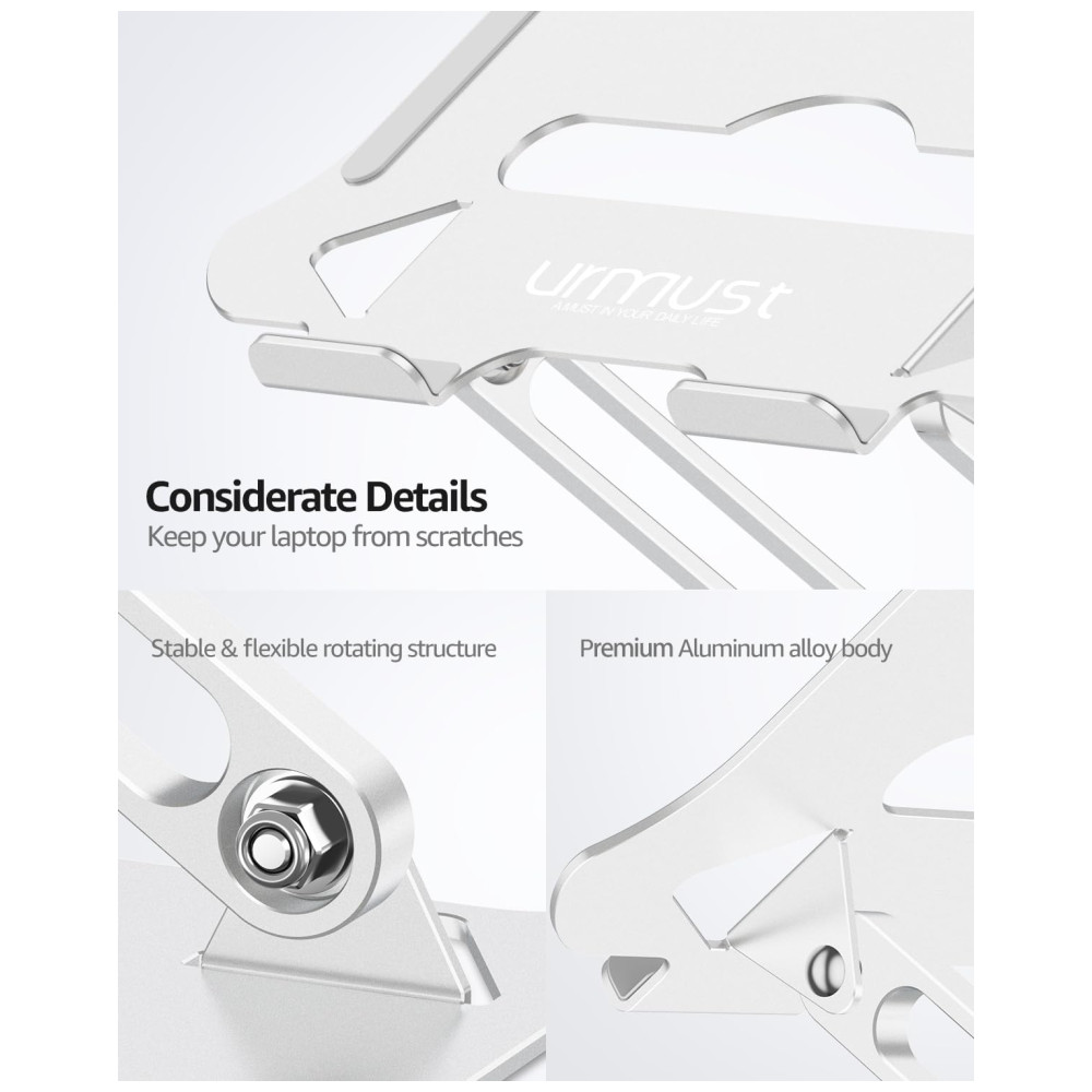 Estilo Suporte para laptop , Suporte para tablet Suporte para telefone , Suporte para tablet Seleção de cores Preto, Prata, Ouro rosa, Vermelho, Azul, Cinza, Cinza azulado Preto, Prata, Ouro, Ouro rosa, Vermelho, Azul, Preto cinza, Prata , Ouro Ouro rosa Preto, Prata, Ouro, Ouro rosa, Vermelho, Cinza Material Liga de alumínio compatível com Todos os laptops de 25cm 40cm. Todos os telefones celulares e tablets de 10 25cm. Como almofadas sob o suporte o tornam mais estáveis. Orifício de altura perfeito, design perfeito para os ombros, ergonômico você pode ajustar a altura e o ângulo perfeito do laptop nos ombros. Urmust Universal Laptop Stand O suporte para laptop da Urmust oferece uma visão de visão do pescoço R e se livrar de dores no ombro, a melhor escolha para você usar o laptop por muito tempo. Eleva seu laptop e ergonomia para um fluxo de visão ideal Altura para melhor conforto O design aberto permite o resfriamento e resfriamento para laptop, sob manter seu teclado e mouse. Os materiais de liga de alumínio premium fornecem aparência elegante e toque suave. Compatibilidade universal serve para todos os notebooks de 25 a 40cm, robusto e forte o suficiente para aceitar notebooks de até 4 kg. Protetor de Borracha Antideslizante. Como almofadas de borracha de silicone antiderrapantes na parte superior evitam que seu laptop seja arranhado e na parte inferior, mantenha em uma posição e não se mova. Ângulo de ajuste pode ser ajustado e facilitar a resistência de suas costas e pescoço mais confortável. Não são ferramentas importantes de ajuste, apenas um empurrão ou puxão, se você desejar que ele suba desça. O design de melhor fluxo de ar para seu laptop está disposto a evitar e o design de fluxo de ar para seu laptop sem se preocupar com o superaquecimento
