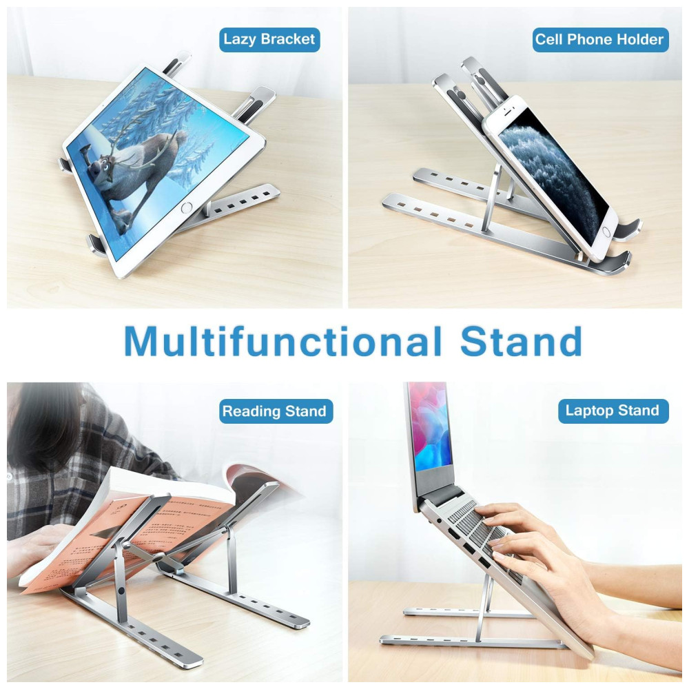 PROJETO AJUSTÁVEL DE MÚLTIPLOS ÂNGULOS O suporte para laptop e tablet oferece altura ajustável de 6 velocidades, ajuste para um ângulo de operação confortável e altura com base em sua necessidade real. E o design ergonômico facilita a observação e a digitação, aliviando dores no pescoço, ombros e coluna.