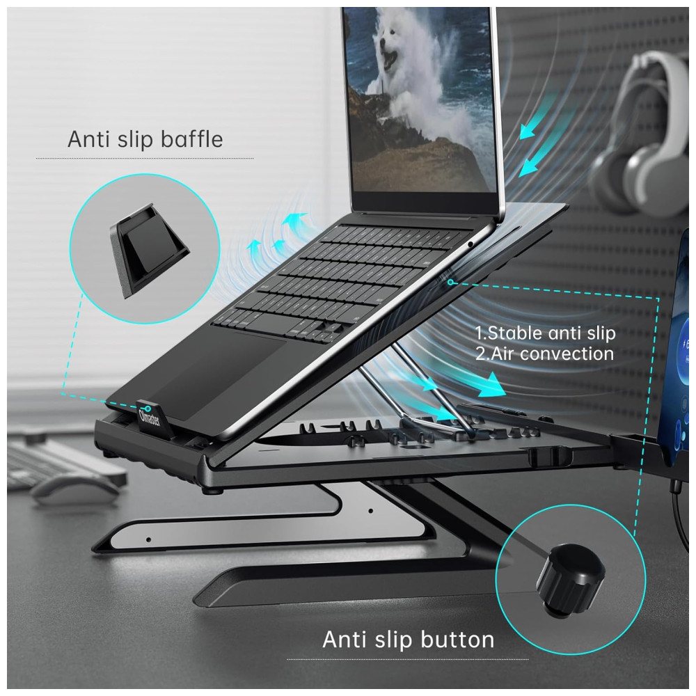 O suporte para laptop de design ventilado tem um orifício na superfície para aumentar o fluxo de ar na parte inferior do notebook, rápida dissipação de calor. O suporte para laptop tem um orifício na superfície para aumentar o fluxo de ar na parte inferior do notebook, rápida dissipação de calor. 9 Ângulos de visão ajustáveis, curvar se sobre o laptop por horas irá colocá lo em risco de ferimentos e dores relacionados ao computador. Este suporte para laptop é projetado especificamente com vários ângulos, basta ajustar o ângulo e personalizar a posição para combinar perfeitamente com sua altura, localização e estilo de acordo com suas necessidades, o que ajudará a corrigir sua postura e diminuir o cansaço e dor em seu corpo após longas horas de sentar e curvar desconfortáveis. Dobrável e portátil Dobrável em um tamanho compacto, não ocupa muito espaço, é conveniente para usar em casa, no escritório ou para onde quer que você vá, o melhor parceiro de negócios ou viagens Design inovador da barra intermediária O lábio frontal para segurar o laptop é projetado no meio da placa de suporte, é um grande conforto ao digitar, sem dor no pulso. Estrutura estável. Os suportes de design tipo Z e material de metal premium, suportam até 10kg e são muito estáveis, mantendo seu dispositivo . Seu Desktop Organizer 2 suportes estendidos convenientes para seu telefone e lápis. Suportes ajustáveis criam espaço para seu teclado, mouse, livros. Etc
