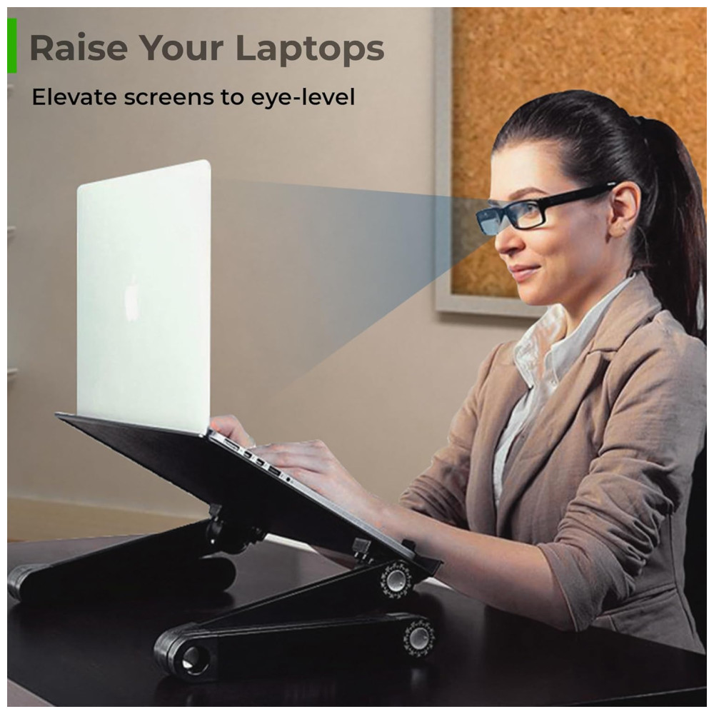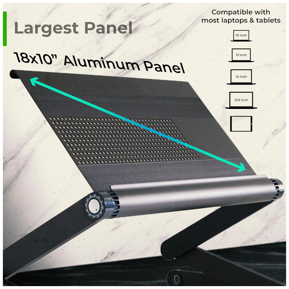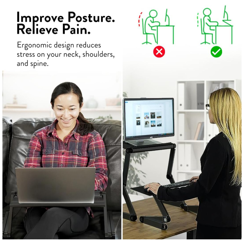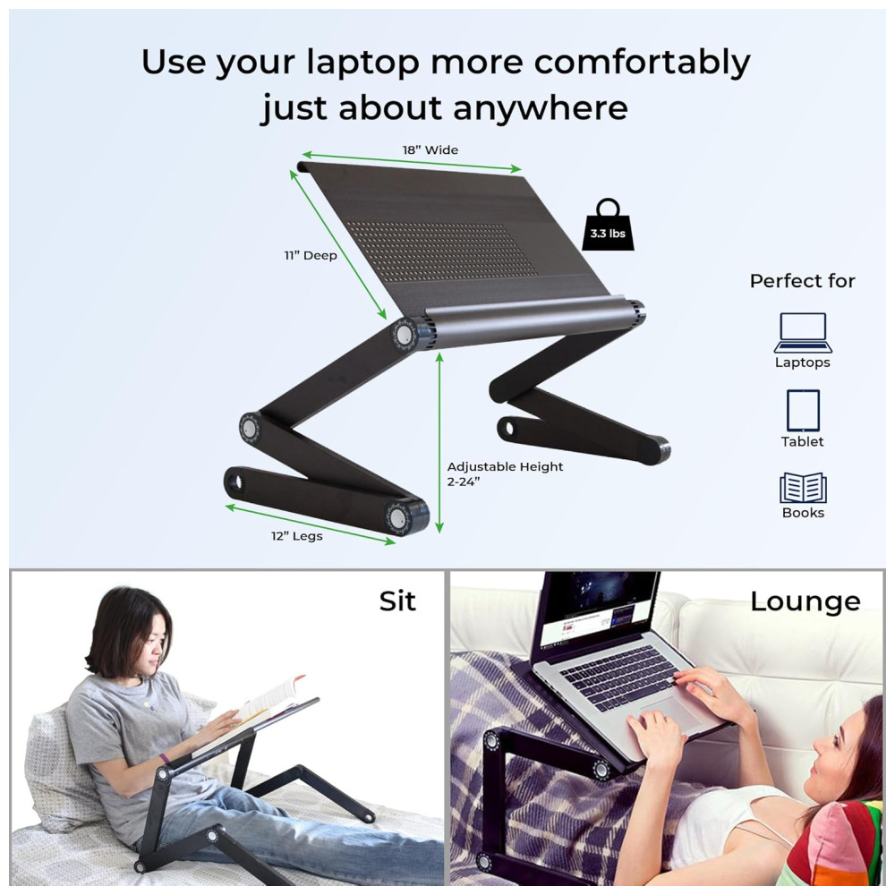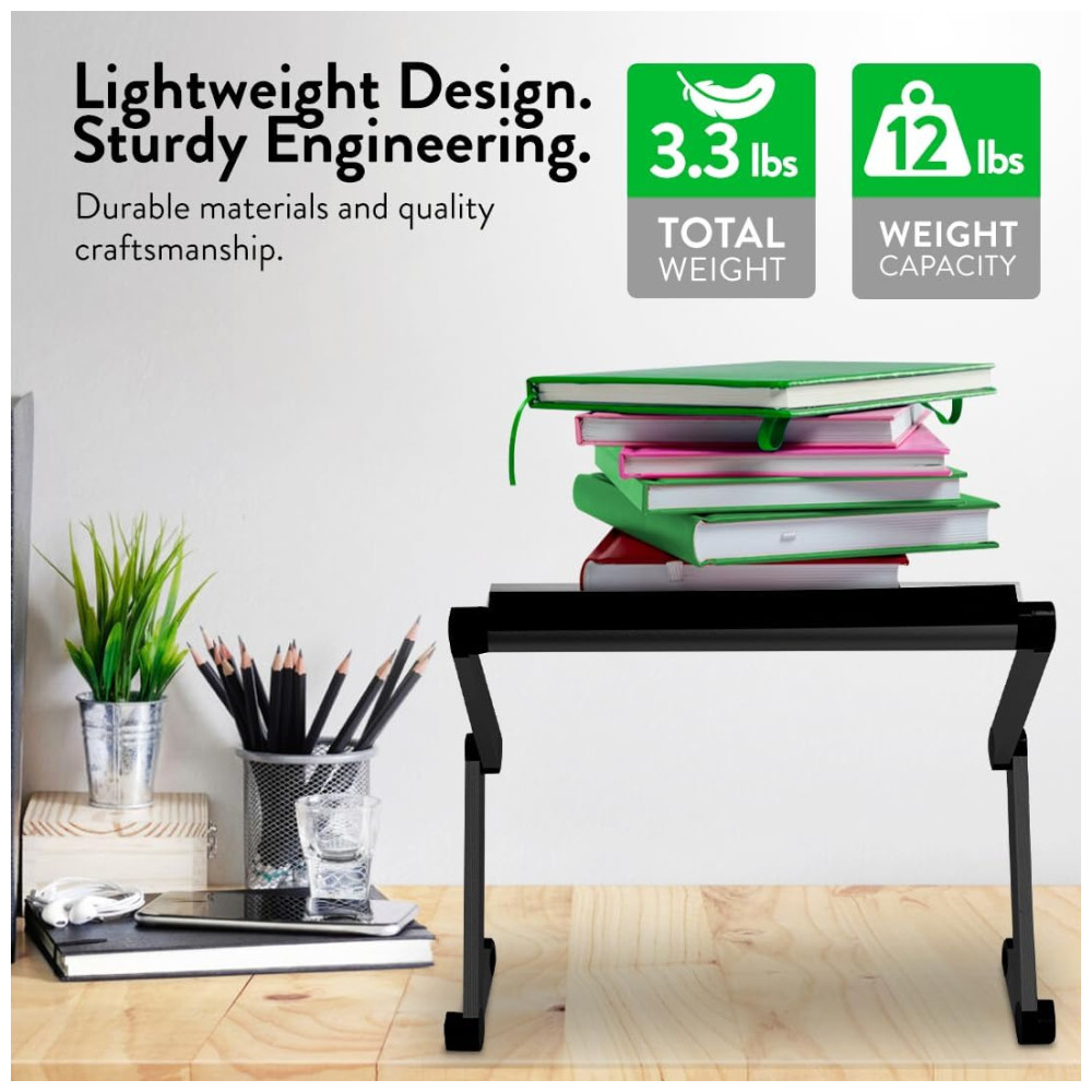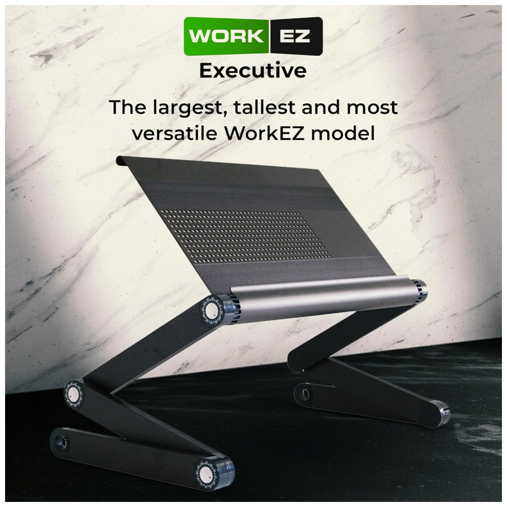 Cor Preto Estilo WorkEZ Executive é um suporte ajustável para laptop que funciona em qualquer lugar no sofá, na cama, sentado em uma mesa e até em pé. O suporte leve e durável é feito de alumínio anodizado de alta qualidade e dissipa naturalmente o calor para resfriar laptops. Cada perna tem articulações especiais que ajustam o suporte para cima e para baixo, ajustando a altura e o ângulo para posicionar perfeitamente as telas para um conforto ideal. Não apenas para laptops, o WorkEZ Executive também mantém tablets, livros e monitores em uma posição ergonomicamente correta. Quando você termina de usá lo, todo o suporte desaba em um pacote fino e plano. USOS 1 LAP DESK Calcule mais confortavelmente deitado na cama ou deitado no sofá. Levante os laptops do colo, mantenha os frios e incline as telas para reduzir o brilho. 2 RISER DE LAPTOP AJUSTÁVEL A maneira perfeita de melhorar sua postura Eleve as telas confortavelmente até o nível dos olhos, incline as telas para reduzir o brilho, resfrie laptops, libere espaço e organize sua mesa. 3 MESA PARA LAPTOP DE PÉ Uma maneira simples e acessível de se levantar e trabalhar em qualquer mesa. Eleve as telas de até 56cm, incline o painel e feche rapidamente o suporte quando terminar. 4 SUPORTE DE LEITURA Um incrível suporte de leitura ergonômico de ângulo e altura ajustável eleve os livros ao nível dos olhos, incline a página e libere espaço na mesa. O porta livros perfeito para alunos 5 RISER DE MONITOR DE COMPUTADOR Eleve os monitores ao nível dos olhos com este suporte de altura ajustável. ESPECIFICAÇÕES 1 Dimensões externas 22x12x3 em 2 Tamanho do painel 18×10 em 3 Largura entre as pernas 20,8 em 4 Peso do produto 1,3kg 5 Material Alumínio