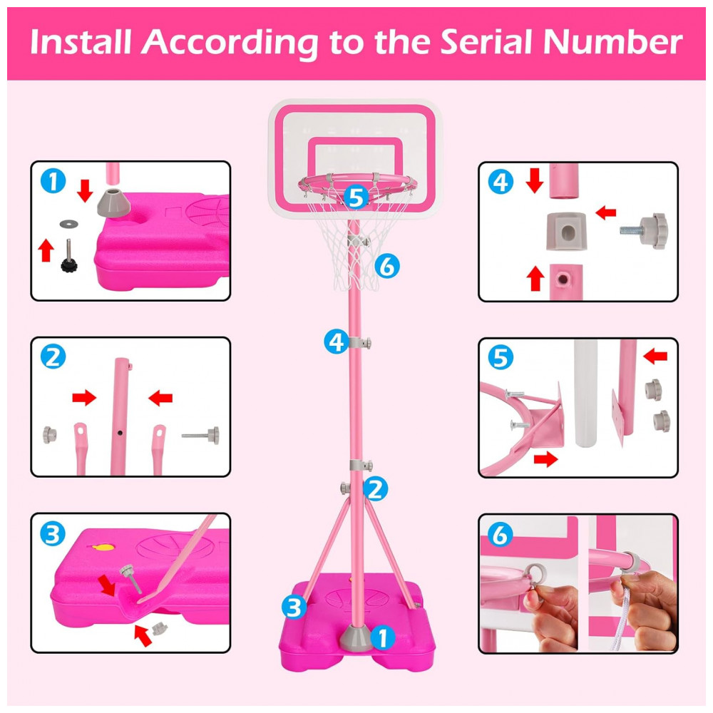 Conteúdo da embalagem: 1 tabela de basquete infantil Tsomtto rosa 2011P, 2 bolas, 1 bomba de ar, acessórios de montagem