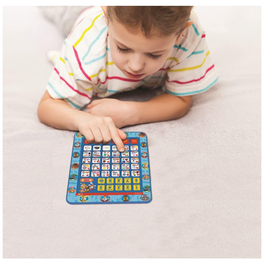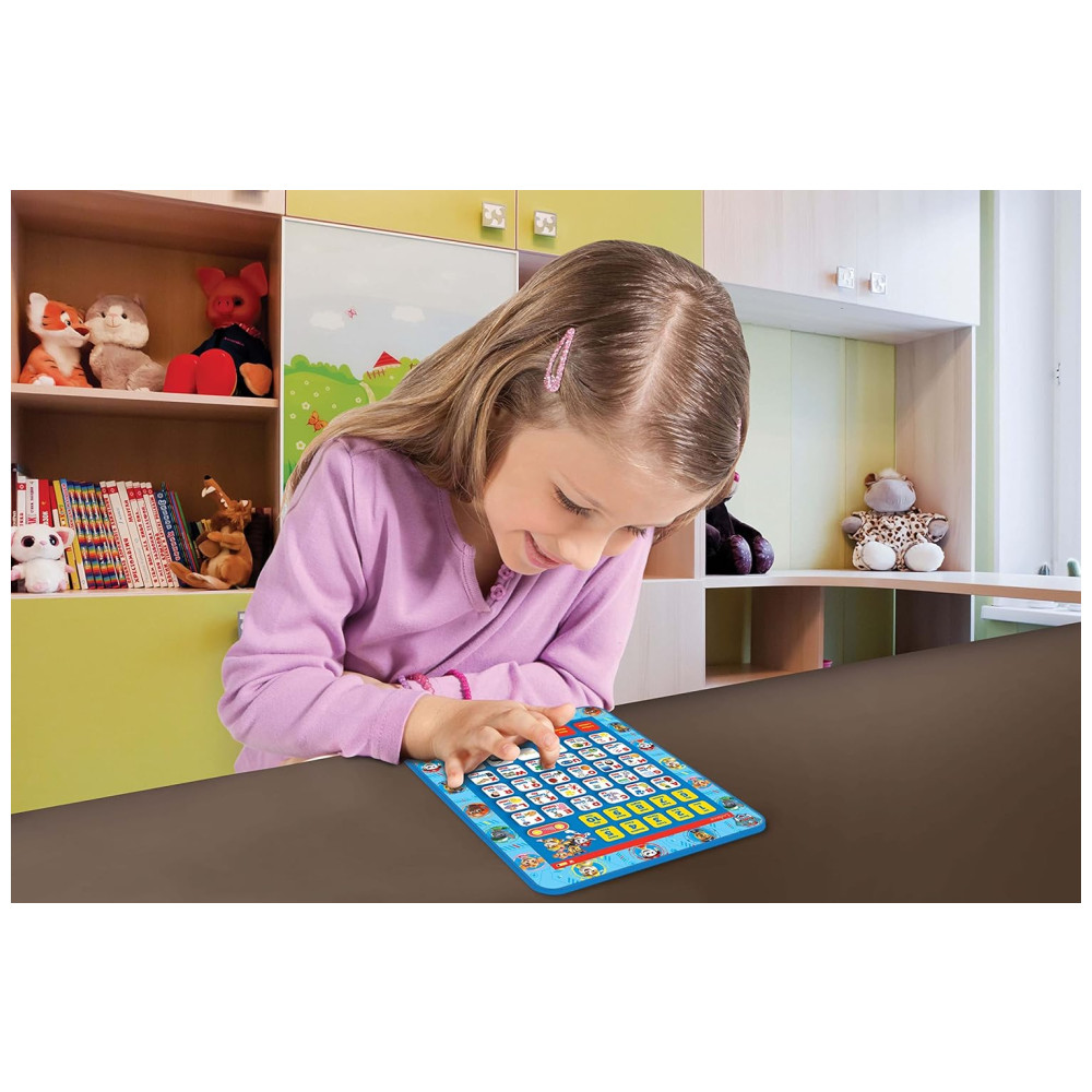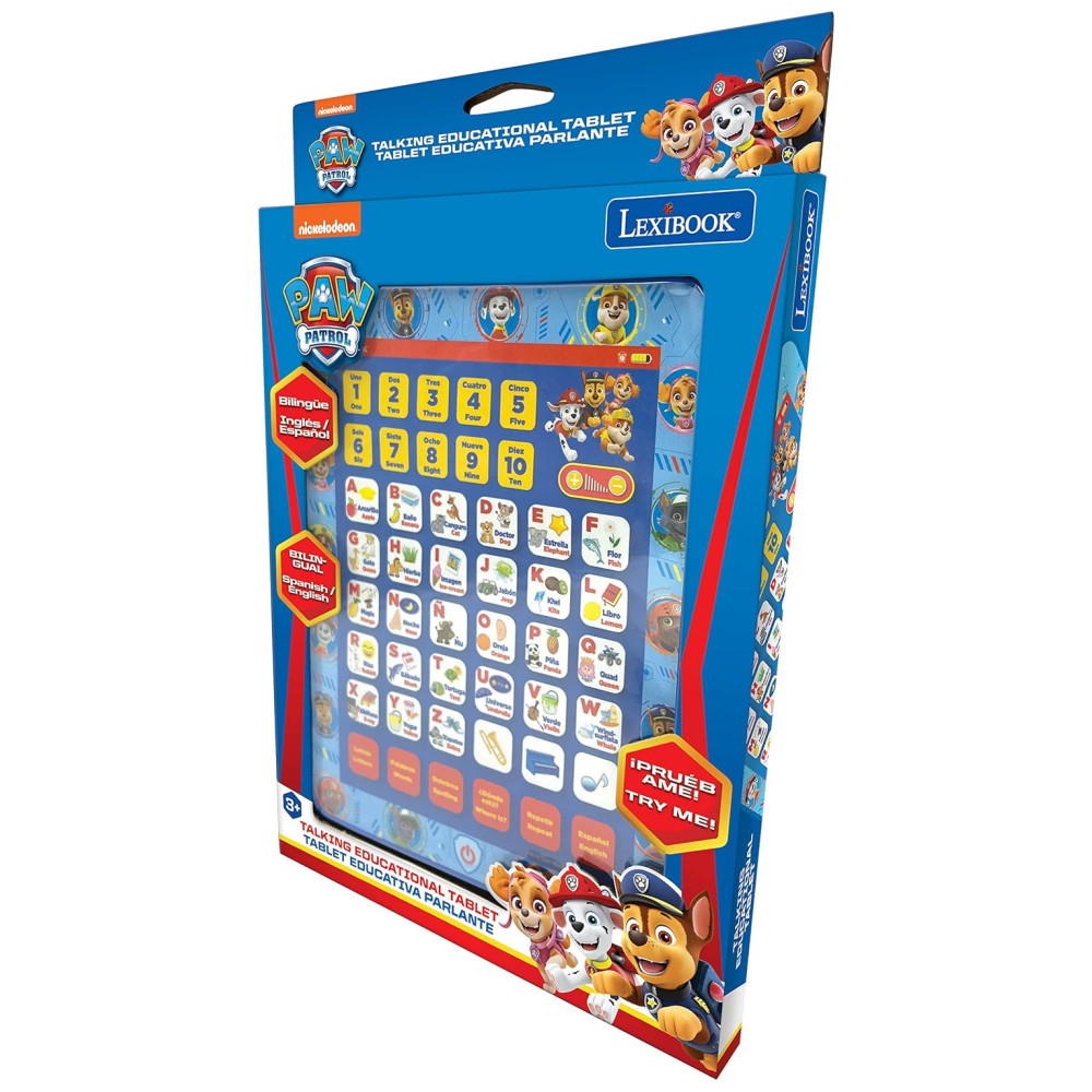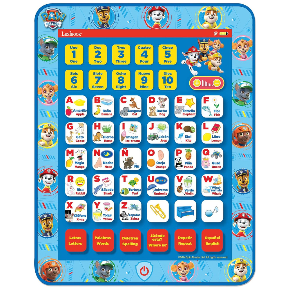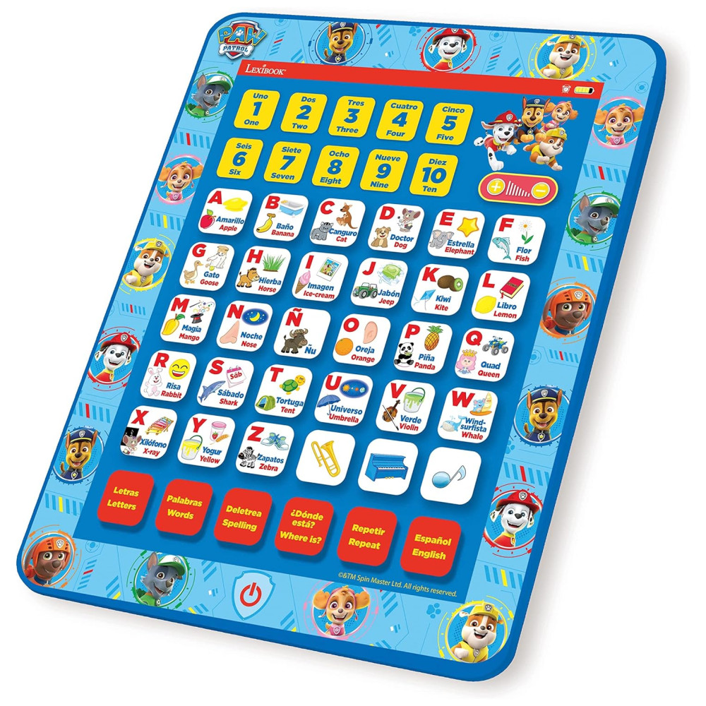 Tablet Educacional Bilíngue Inglês e Espanhol da Patrulha Canina Brinquedo para Aprender Alfabeto Letras Números Palavras Ortografia e Música LEXiBOOK Azul