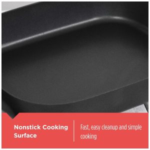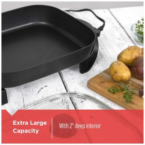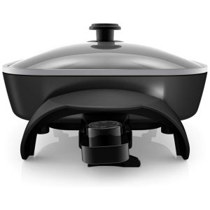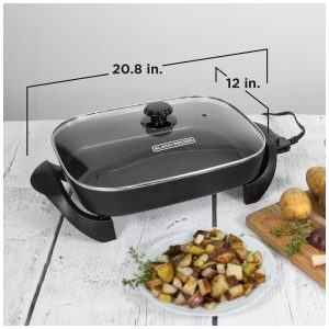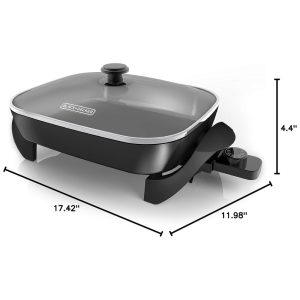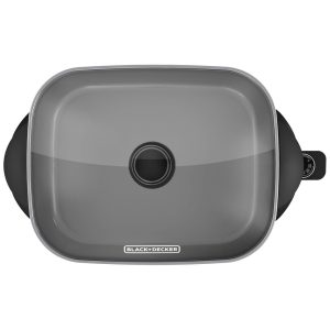 Descrição do produto O Black Decker Skillet possui uma grande área de cozimento e um interior profundo para um cozimento saudável para toda a família. Vá da cozinha para a mesa de jantar com controle de temperatura variável de liberação rápida e alças de toque frio perfeitas para servir a mesa. O excesso de gordura é removido com a perna da panela para afastar o óleo e as gorduras do que estiver cozinhando. Os recursos incluem uma superfície de cozimento de 30x35cm com revestimento antiaderente durável para limpeza fácil, faixas de controle de temperatura variável removíveis de manter quente a 200 graus, base segura para lava louças, base de toque frio com alças, tampa de vidro temperado. Por BLACK DECKER