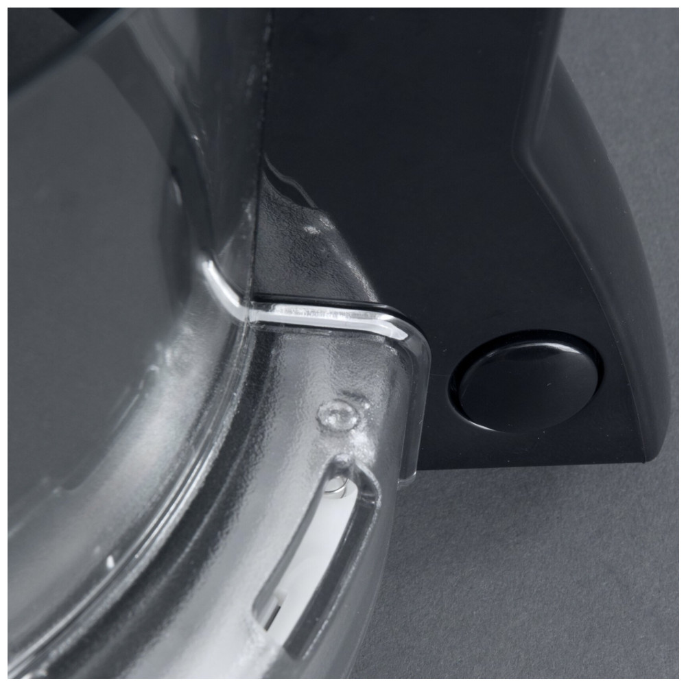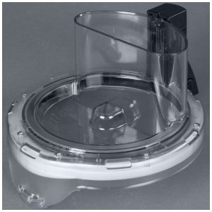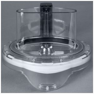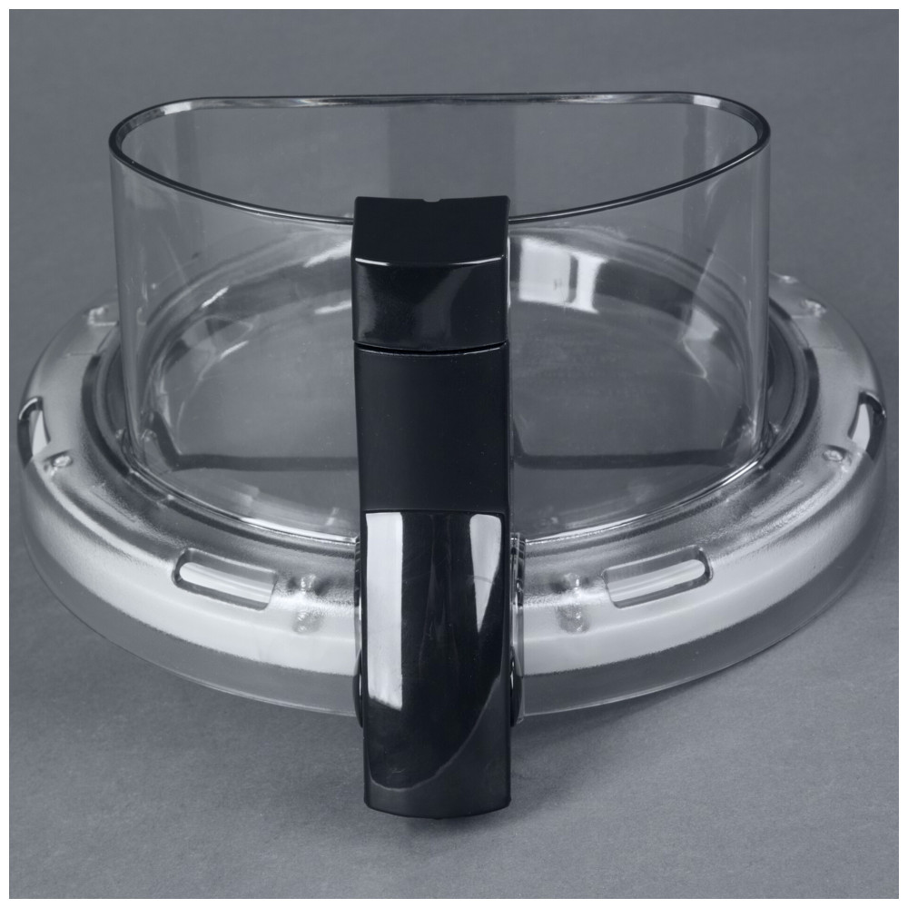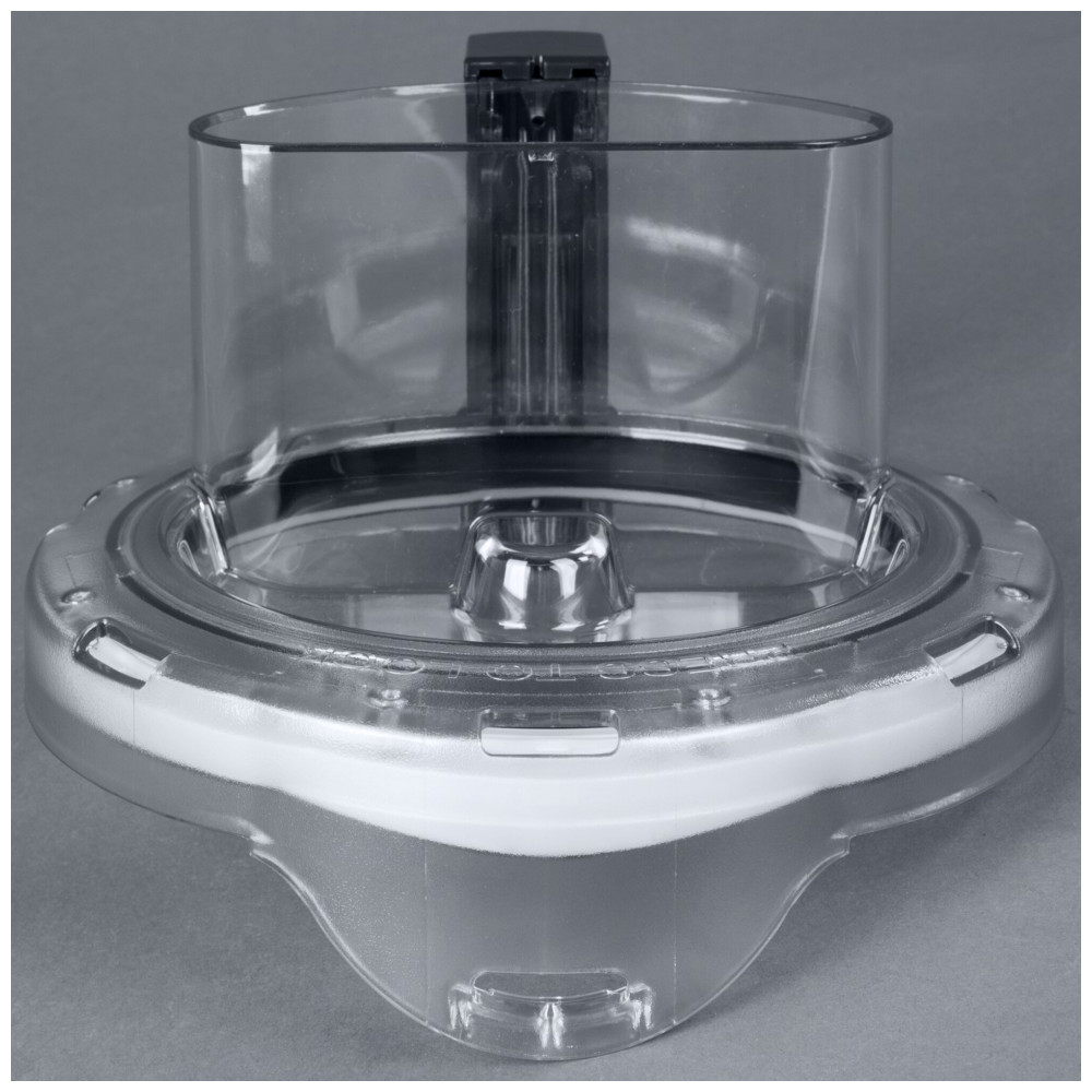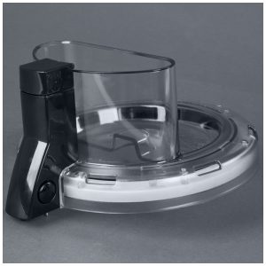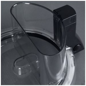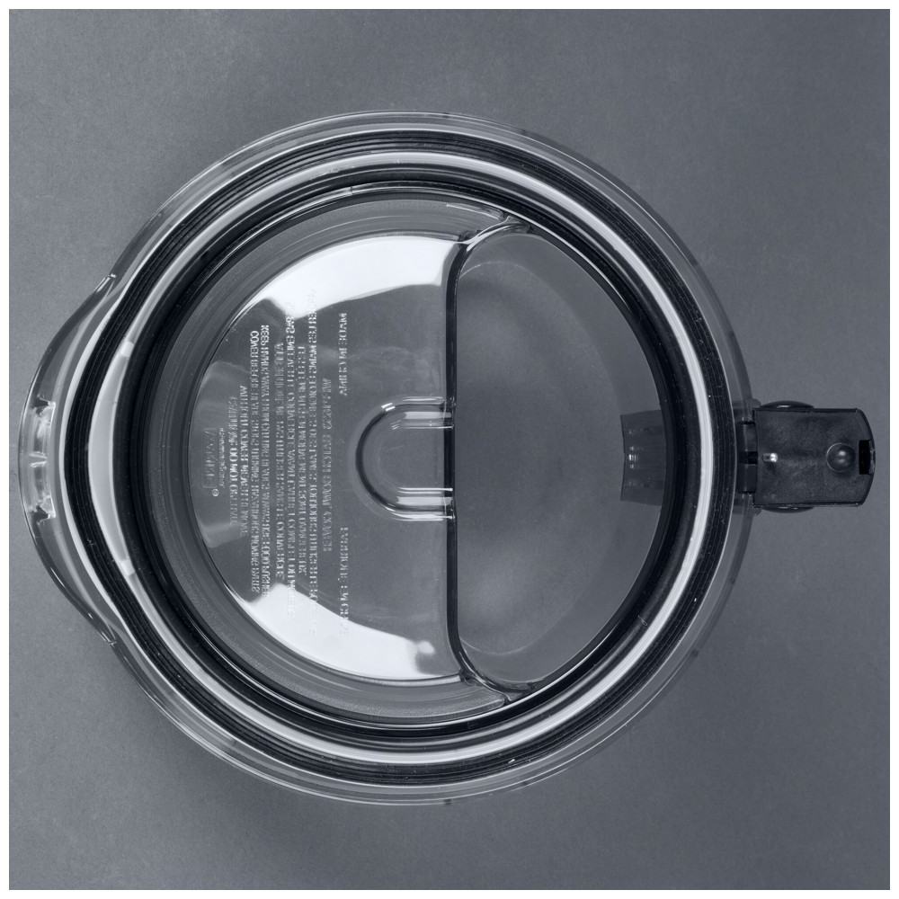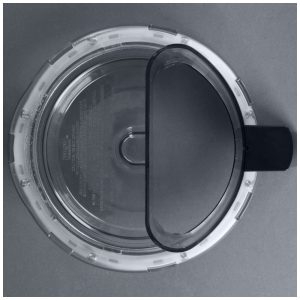 Sistema de travamento mantém lâmina S fixa durante despejo inclinado da tigela. Tampa plana compatível com empurrador integrado para pressionar alimentos contra discos de corte, ralar ou fatiar.