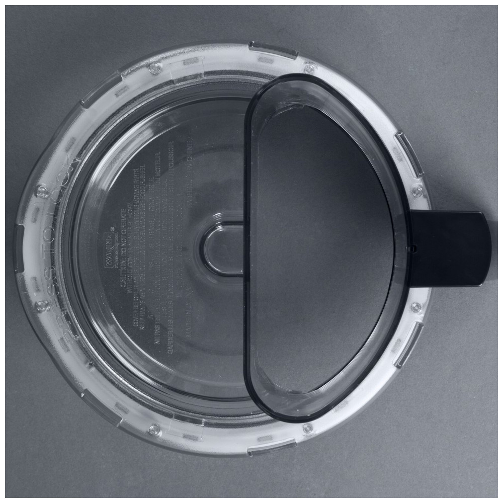 Tampa Waring WFP16S3A para tigela de lote de 4 qt (3,8 L), acessório projetado para processadores de alimentos da linha WFP16S em cozinhas profissionais. Inclui funil de alimentação vertical que permite inserção contínua de ingredientes durante operação em modo batch, mantendo vedação hermética para líquidos como sopas e molhos. Suporta processamento seguro de volumes médios com monitoramento visual pela tigela transparente.