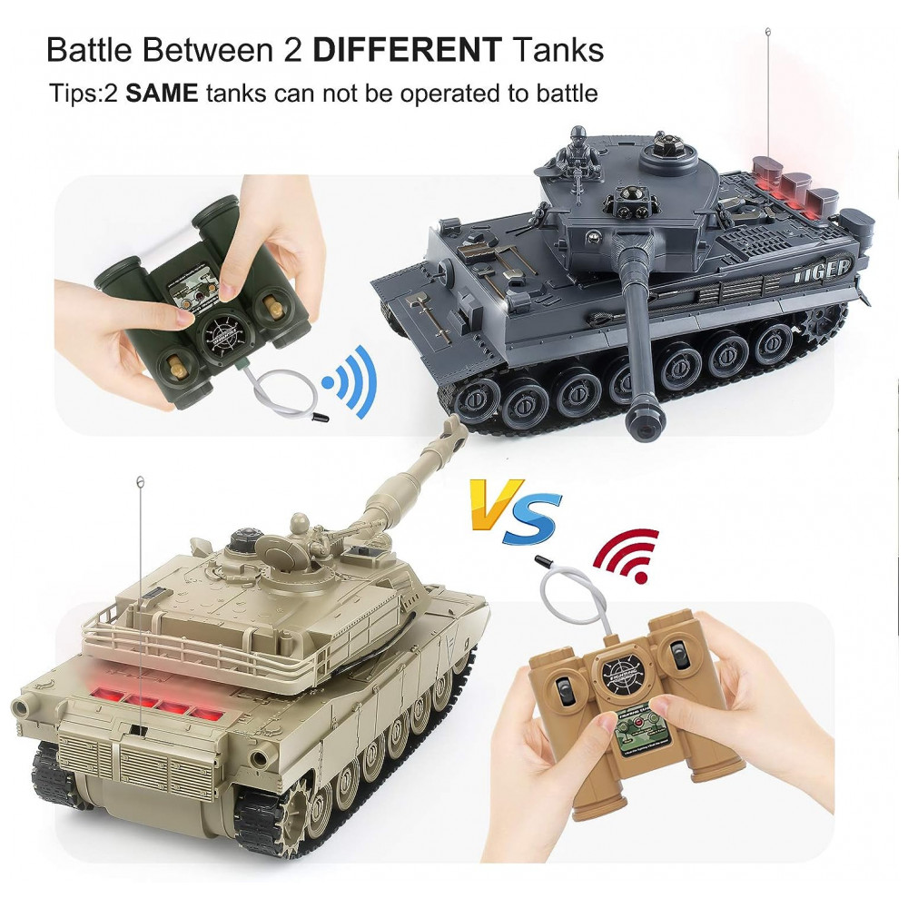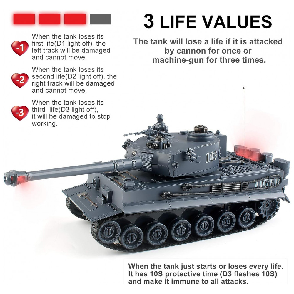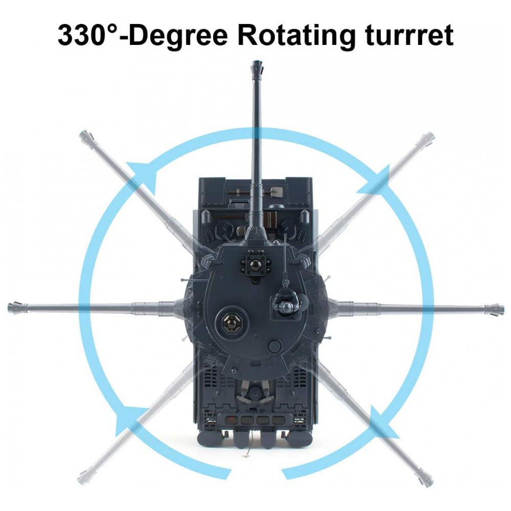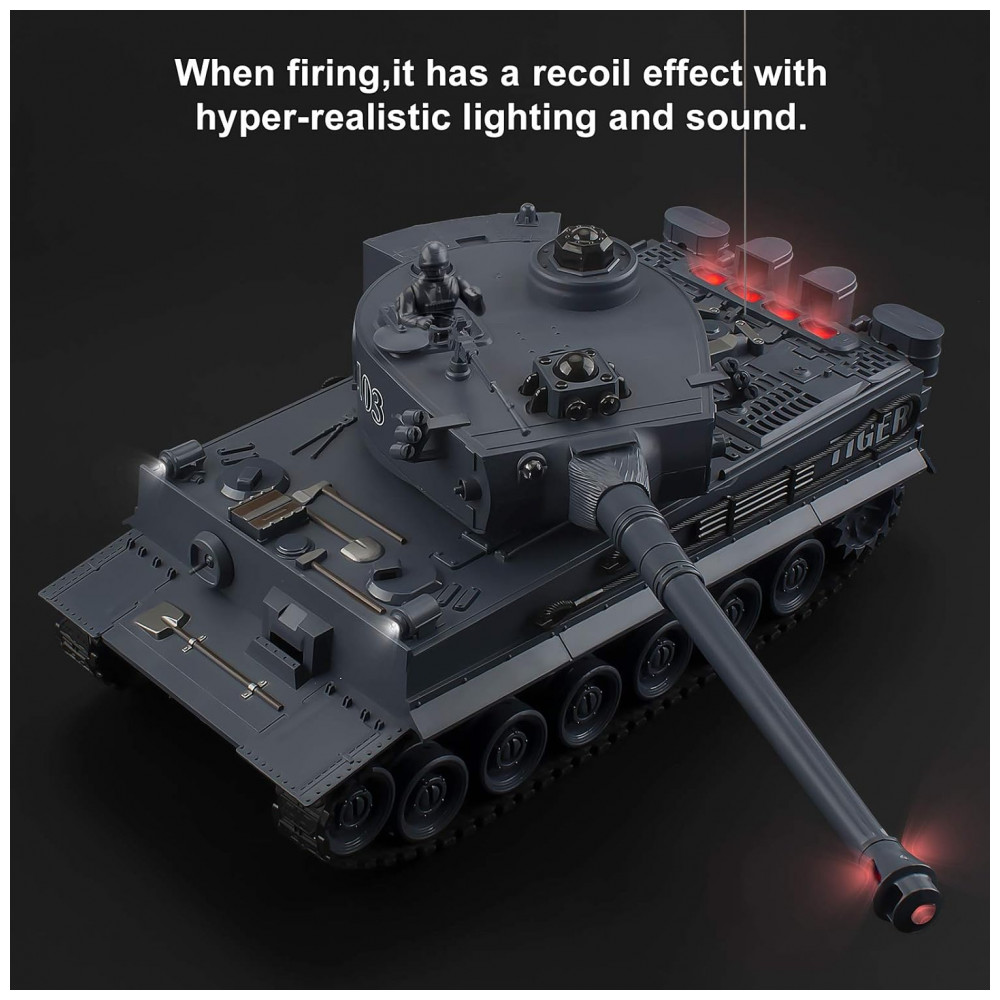 Este Tanque Tigre Alemão de Controle Remoto é uma incrível coleção de modelos de tanques militares da Segunda Guerra Mundial. Com detalhes de alto nível, este brinquedo não é apenas divertido para simular exercícios militares e aventuras de guerra, mas também é uma ótima peça de coleção. Ele possui um carregador USB atualizado que é compatível com os EUA. Além disso, o tanque dispara com ação de recuo realista, aciona dois degraus, lança canhão de raios infravermelhos, torre giratória de 330 graus para a esquerda e para a direita, move-se para frente e para trás, rotação de 360 graus para a esquerda e para a direita, com sons e luz realistas e muito mais. A torre do forte pode girar 330 graus para a esquerda e para a direita, atirando e destruindo inimigos em todas as direções. Ao disparar simulado, ela tem um efeito de recuo com iluminação e som hiper-realistas que farão seus meninos se sentirem como um verdadeiro comandante. O tanque também possui uma função de autoshow que começa dentro de 10 segundos após a partida e dura por 45 segundos, a menos que receba alguma operação do controle remoto.
