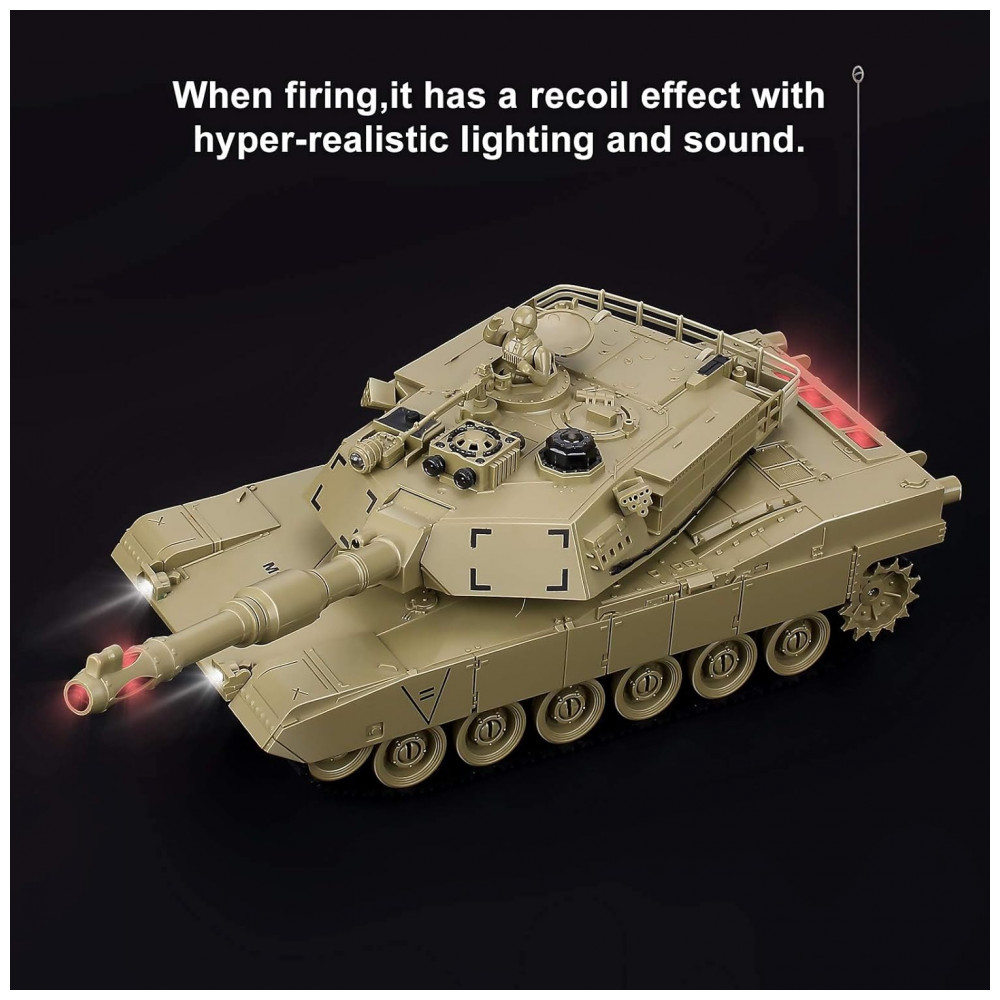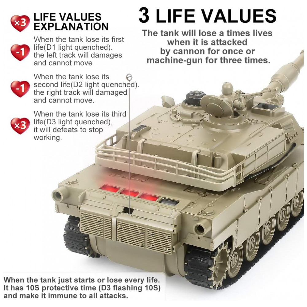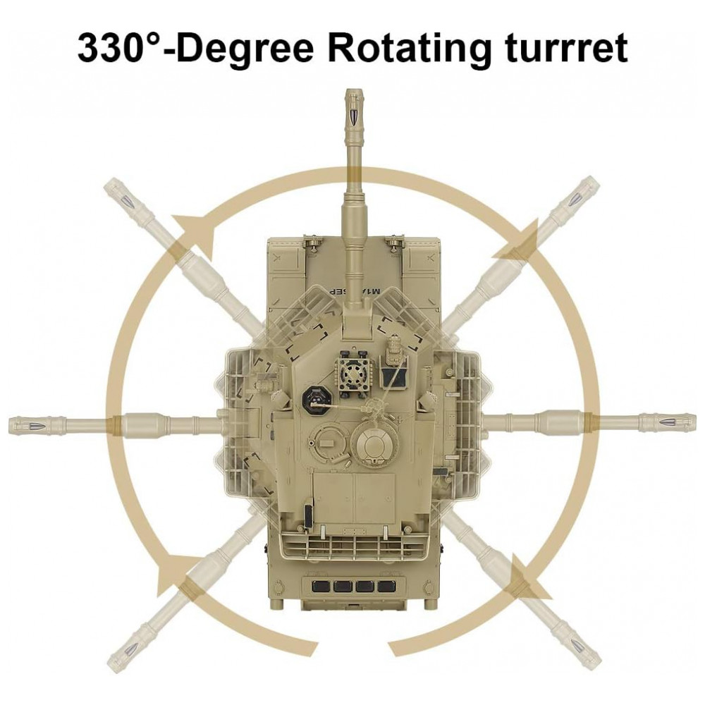 O tanque M1A2 tem recursos incríveis, como ação de recuo realista, canhão de raios infravermelhos, torre giratória de 330 graus para a esquerda e para a direita, movimento para frente e para trás, rotação de 360 graus para a esquerda e para a direita, além de sons e luzes realistas. A torre do forte pode girar 330 graus para a esquerda e para a direita, permitindo que o tanque dispare e destrua inimigos em todas as direções.